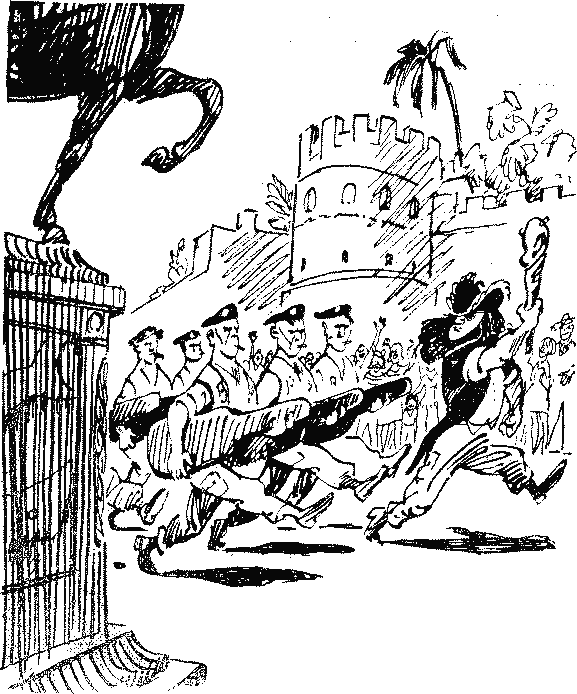 Что же произошло? Почему «Алеша Попович» неожиданно покинул гавань Оук-порта? Можно ли представить себе, что советские моряки бросили в беде своего товарища? Нет, этого представить нельзя. Николай Рикошетников, обойдя все, как ему казалось, помещения сената в поисках Геннадия, выбежал на площадь и оказался в центре событий, развязанных мрачными хулиганами с Карбункла. Площадь кишела людьми. Местами возникали стычки, переходящие в кулачный бой. Ораторы, взобравшись на фонарные столбы, кричали в толпу. Ревели моторы мотоциклов. Группа мужественных горожан, взявшись за руки, защищала свою святыню — памятник Серхо Филимоныч Страттофудо. Рикошетников помчался на судно, мигом собрал совещание комсостава. Половина экипажа была направлена в город на поиски пропавшего мальчика. Всем морякам было строжайше заказано выспрашивать о мальчике у местных жителей и тем более называть его имя. Рикошетников боялся, и не без основания, что «копальщики» могут узнать о пребывании в городе потомка благородного русского адмирала и устроить на него настоящую охоту. Тем временем возвратились с тренировки судовые футболисты. Они рассказали, что большинство публики горячо их приветствовало, а меньшинство наоборот — бросало в них дохлых крыс, пищевые отбросы и — увядшие цветы. Меньшинство это было весьма ретиво и затянуто в черную кожу. Рассеялось оно только тогда, когда появился гигант в плавках из леопардовой кожи — лучший футболист всех времен и народов, добродушный, но неразговорчивый Рикко Силла. Поиски Геннадия продолжались несколько часов и не дали никаких результатов. Потрясенный Рикошетников решился тогда на крайний шаг — он снова отправился в сенат. В сенате уже все спали. Семижильный «резинщик», похрапывая, тянул свое: — В свете изложенного, опираясь на параграф девяносто, пункт «Д», отдела восемнадцать, можно категорически заявить, что производство пуговиц на территории республики может быть разрешено только лицам, доказавшим свою способность к оному… Рикошетников разбудил того сенатора, который дал резкую отповедь проискам полковника Бастардо Мизераблес ди Порк-и-Гусано. Толстяк в футболке под номером «З» повел его в свой кабинет для конфиденциальных переговоров. Имя сенатора было Нуфнути Куче. Рикошетников рассказал ему все. Нуфнути Куче выслушал его с крайним вниманием. В маленьких его глазах, отягощенных трехъярусными мешками, пылал неподдельный интерес. — Видите ли, капитан, — сказал он, — я не могу вам раскрыть всей подоплеки нынешних событий в нашей стране, потому что и сам ничего не понимаю. Скажу только, что передовая интеллигенция, рабочий класс и спортсмены очень озабочены неожиданной и непонятной атакой с острова Карбункл. В других условиях приезд потомка адмирала Серхо Филимоныч Страттофудо мог бы превратиться в национальный праздник. Сейчас, увы, мы не можем предугадать развитие событий. Эмпирейцы слишком доверчивы и простодушны. Это дети, сэр. Я обещаю вам, что я и мои люди — скажу по секрету, их немало — предпримут все усилия для поисков мальчика. Я не исключаю возможности того, что он попал в лапы негодяев, но… — Нуфнути Куче встал перед Рикошетниковым на одно колено и торжественно провозгласил. — Клянусь созвездием Кассиопеи, катамараном старого Йона, цепями египетских рабов, ржавыми мечами викингов, четкам