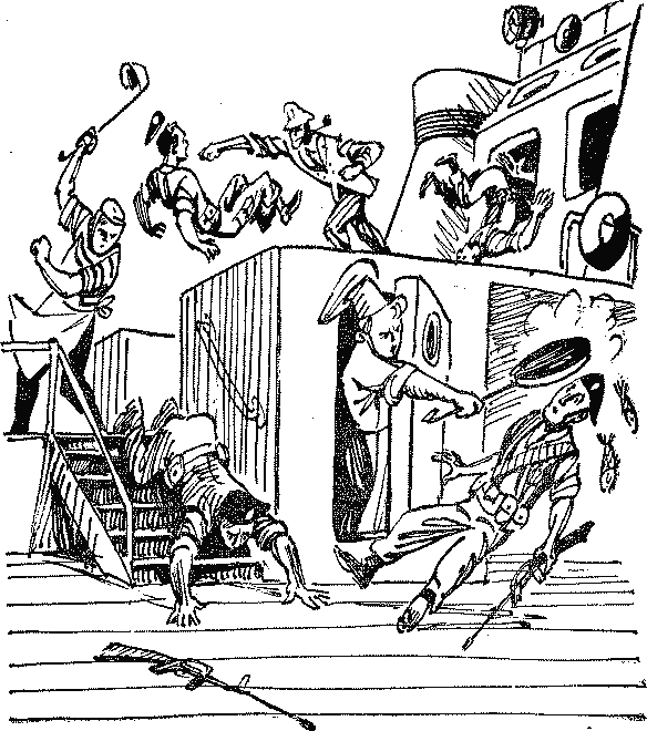 Наемники согнали весь экипаж в помещение столовой. Возле каждого иллюминатора встали автоматчики. С подводной лодки на борт «Алеши Поповича» началась спешная погрузка какого-то старого оружия, ржавых винтовок, поломанных минометов и пулеметов. В этом и состоял зловещий план Ричарда Буги: показать наивным эмпирейцам, что «Алеша Попович» набит оружием, что советские моряки вовсе не исследовали прибрежный шельф и впадину Яу, а, напротив, готовились захватить их маленькую страну. Чаби Чаккерс в ярости от своего бессилия и невозможности помочь друзьям кружил вокруг «Алеши Поповича». Вдруг он услышал крик: — Эй, да это, никак, ты, сержант? С борта «Поповича» свешивался долговязый татуированный детина. Чаби сразу узнал его и хрипло выругался. — Годдем! Это ты, Фрэнки Карбо! Мало тебе Мьетвиня, сукин сын! — Здесь мне побольше платят! — хвастливо крикнул Фрэнки. — Чтоб ты подавился этими деньгами, ублюдок! — гаркнул дельфин. — Плачет по тебе военно-полевой суд, дезертир! — заорал Фрэнки. — Пусть плачет! — рявкнул Чаби, выпрыгнул из воды, схватил своими могучими челюстями негодяя за чуб и увлек его в пучину. Одним бандитом в мире стало меньше. Между тем в помещение столовой вошел элегантный господин в светлом костюме, мистер Кингсли Брейнвен Мамис. — Господин капитан, господа! — вежливо обратился он к экипажу «Поповича». — Вы можете чувствовать себя почти в полной безопасности. От вас требуется очень немногое. Нужно, чтобы по приходе в Оук-порт один из вас — предпочтительно вы, господин капитан, — выступил перед населением и рассказал всю правду. — Какую правду? — спросил, скрестив руки на груди, Рикошетников. — Нужно снять маску, сэр, — улыбнулся Мамис. — Рассказать народу о военном характере вашей экспедиции, о планах захвата этих живописных островов. Ведь ваше судно напичкано оружием, буквально нафаршировано им, сэр. Рев возмущения вырвался из десятков глоток. Рикошетников встал. — Никто из нас никогда не пойдет на это. Ваша провокация обречена на провал. — В таком случае вас всех придется уничтожить, — печально улыбнулся Мамис. — Наше правительство этого так не оставит, — спокойно сказал Рикошетников. — Шутите с огнем, мистер. — Ваше правительство далеко, а наши автоматы близко. — Мамис посмотрел на часы. — Десять минут на размышление, господа. После этого откроем огонь. Прошло пять минут. Мамису стало не по себе под взглядами этих словно высеченных из камня лиц. — Начнем с вас, капитан, — пробормотал он. — Благодарю за честь, — усмехнулся Рикошетников. «Крепкие ребятишки, — нервно подумал Мамис. — Неужели придется стрелять? С советскими действительно шутки плохи». — Отдаю должное вашему мужеству, господа, но я тоже выполняю свой долг. — Грязный долг, — пробасил Шлиер-Довейко. Прошло десять минут, когда вдруг поднялся плотник Володя Телескопов. — Ну, ребята, раз уж никто из вас не хочет рассказать правду, тогда уж мне придется, — сказал он, почесывая в затылке. — Английским владеете? — радостно крикнул Мамис. — А как же, — ухмыльнулся Телескопов. — Сёртенли[11]. — Идите за мной!