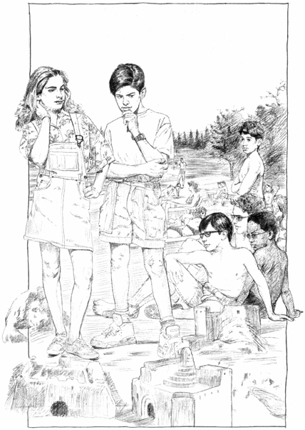 Энциклопедия и Салли рано утром в субботу отправились на пляж, чтобы посмотреть на песчаные скульптуры. За день до того дети и взрослые с рассвета до заката копали, формировали и разглаживали песок. Вдоль линии прилива поднялась страна чудес из замков, животных, улиц и кораблей. К вечеру выбрали только победителей среди взрослых. Судейство детских скульптур пришлось отложить до утра. Детективы стремились увидеть, что сделал Пабло Пизарро. Пабло был величайшим десятилетним художником Айдавилля. Детские скульптуры стояли отдельно от взрослых. Энциклопедия увидел два замка, одного льва и одну кучу комков. Рядом лежали, загорая на солнце, трое молодых художников – Кевин Бэйнс, Марти Гинсберг и Ланс Уиллс. Все были в купальных костюмах и солнцезащитных очках. Пабло, самый юный из них, сидел отдельно. Он заметил детективов и поплёлся к ним. – Прости, мы не смогли прийти вчера, – извинился Энциклопедия. Пабло был не в состоянии принять что-либо, кроме несчастья. – Кто-то разбил мой замок, – грустно прохныкал он. И подвёл детективов к куче комков. Салли пришла в ярость. – Энциклопедия, как ты думаешь, это не его соперники? Кевин, Марти и Ланс теперь имеют больше шансов на победу! Энциклопедия не ответил. Он изучал беспорядочные следы босых ног на сухом песке у руин Пабло. Марти и Ланс, как он заметил ранее, были босиком; Кевин – в сандалиях. – Следы могут сказать нам, кто разбил замок Пабло? – спросила Салли. – Никаких шансов, – вздохнул Пабло. – Вчера вокруг скульптур толпилось чуть не двести человек. Энциклопедия перешёл на сторону бывшего замка Пабло, глядевшую на океан. На гладком, влажном песке не было ни единого следа. Кроме свежей линии прилива, остановившейся в нескольких дюймах от разрушенного замка. – Мы никогда не узнаем, кто это сделал, – простонал Пабло. – Ты можешь починить то, что осталось? – спросил Энциклопедия. Пабло застонал ещё сильнее: – Как? Судейство начинается через пятнадцать минут. – Тесси! – вдруг воскликнула Салли. – Следовало знать, что она обязательно появится там, где Кевин. Энциклопедия повернулся. И увидел Тесси Боттомс, похожую на моржа в розовом купальнике, с пуделем по кличке Обнимашка. – Обнимашка должен быть на поводке, – заявил Энциклопедия. – Именно, Тесси, – присоединилась Салли. Салли не нравилась Тесси, большая, нахальная восьмиклассница, которая вечно пыталась воспитывать малышей.