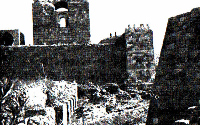 Библ. Городская стена с контрфорсами (примерно 2500 г. до н. э.) у подножия крепости крестоносцев. Правее контрфорсов остатки самой древней стены города (около 2800 г. до н. э.), к которой примыкают фундаменты жилых построек примерно тех же времен.