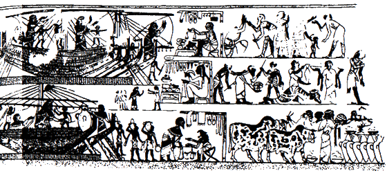 Наглядное представление о торговых связях с сирийскими приморскими городами дают фрески из гробницы Кенамуна в Фивах времени XVIII династии. На них сирийские суда пришвартованы и разгружаются. Прямо на пристани возвышаются маленькие постройки. Разложенные рядом товары и весы говорят о том, что торговцы, по-видимому, торгуют «со свободного причала». Чуть поодаль у пирса идет приемка главного груза от служителя Кенамуна. Смиренные позы купцов соответствуют древнеегипетскому пониманию всякой внешней торговли как формы дани. Конечно, могло случиться, что груз порой состоял как из предметов дани, так и из купленных товаров. Подобные сцены дают интересные сведения о составе товаров, которые доставлялись по морю в Египет из гаваней Ливана и со всего сирийского побережья. На фреске из гробницы Кенамуна обращают на себя внимание быки с большими горбами, которых, по всей вероятности, завозили в Египет для племенного разведения. Рамсес III, например, упоминает, что он повелел доставить храму Амуна в Фивах 19 голов крупного рогатого скота различных сирийских пород. Гигантский глиняный сосуд на борту одного судна, видимо, следует считать винной тарой, как и подобные сосуды, уже сгруженные на берег. В кувшинах с ручками, которые тащат рабы следом за торговцем, можно предположить оливковое масло. В более мелких сосудах, вероятно, содержали мед, а также кедровый бальзам или косметику.