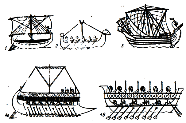 Типы финикийских судов (реконструкция). 1. Торговое судно; XIV в. до н. э. Усыпальница Кенамуна. 2. Торговое судно; около 700 г. до н. э. 3. Парусное судно; II в. н. э. 4а, б. Военные суда; около 700 г. до н. э. Деталь рельефа из дворца Синаххериба