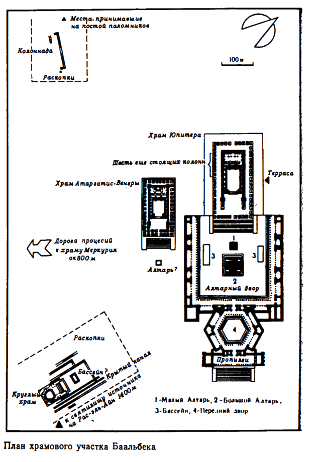 В систему святилищ Адониса нередко включают также и храмовой участок Калаат Факра. Отсюда легко можно добраться до Афки, расположенной в двух километрах на дороге явно древнего происхождения. Однако в Калаат Факра в качестве главного бога почитался, по всей вероятности, Юпитер Гелиопольский. Во всяком случае, надпись подтверждает, что малый храм посвящен здесь богине Атаргатис. Под Юпитером Гелиопольским подразумевается древний Баал долины Бекаа, который в позднеэллинистическое время благодаря арабскому влиянию обрел черты бога Солнца, почему Баальбек и назывался Гелиополем (городом Солнца). Как Юпитер Гелиопольский являл собой смешанный образ, так и его спутница Атаргатис воплощала, различные элементы. Зародившись в Северной Сирии, ее культ уже к началу эпохи эллинизма получил широкое распространение, причем в нем явственно проступали особенности культа Астарты. Сообщение с главным святилищем в Гелиополе не обязательно должно было идти через Афку. Преодолевать гребень Ливана могли и чуть восточнее Калаат Факра в самой южной части седловины между Курнет-эс-Сауда и Джебель-Саннин. Как и современный перевал, древний путь также, видимо, проходил через горы у Хадет, о культовом значении которого в римское время еще говорят развалины двух храмов и монументального алтаря. С основанием Итурейского царства во II в. до н. э. бог Гелиополя (Баальбека) приобретает не только местное значение. Будучи важнейшим культовым пунктом в Бекаа, Гелиополь стал местом главного святилища итуреев. Вероятно, первые грамдиозные культовые сооружения римского времени восходят к итурейским царям. Гелиополь оставался их культовым центром и после превращения его при императоре Августе в римскую колонию. Так же как и Верит, Гелиополь был предоставлен для заселения ветеранам, и колония стала центром римского господства в Бекаа, имевшей важное экономическое и военное значение. Это способствовало развитию зародившегося в Гелиополе культа, которому эллинизированный синкретический образ главного божества сразу придал огромную силу воздействия. Уже в скором времени Юпитер Гелиопольский стал главнейшим богом в наиболее ценимой римлянами провинции и занял такое место в культовой жизни Рима, которое доставалось лишь очень немногим божествам древнего востока. Развитие римского Гелиополя проходилов два этапа. На первом этапе помимо внутреннего благоустройства молодой колонии усилия направлялись также на создание путей сообщения в соответствии с требованиями войск и администрации. Для улучшения связи между Гелиополем и Беритом вновь обратились к древним горным дорогам Верит — Дамаск и Библ — Иаммунэ. По надписям установлено, что при императоре Домициане (81–96) были проведены большие работы на участке Афка — Акура — Иаммунэ. В дальнейшем особенно важным было дорожное сообщение между Гелиополем и Дамаском. Еще и сегодня относительно хорошо сохранившейся римской дорогой ниже гребня Антиливана пользовались вплоть до первой мировой войны. К системе главных дорог относились также сторожевые башни, форты и обходимые пути, которые 'служили защитой путникам и вообще препятствовали возрождению разбоя. Кроме того, они должны были обеспечить эксплуатацию горных лесов по установленным правилам. Не последнее значение имели эти сооружения и для военно