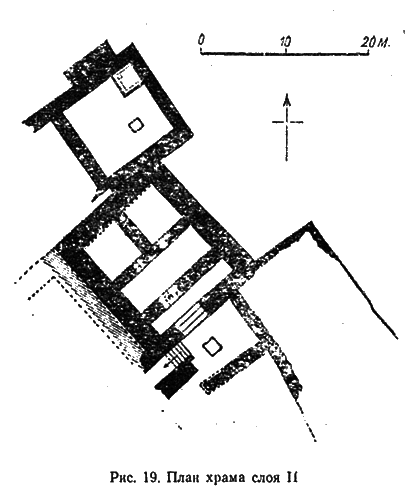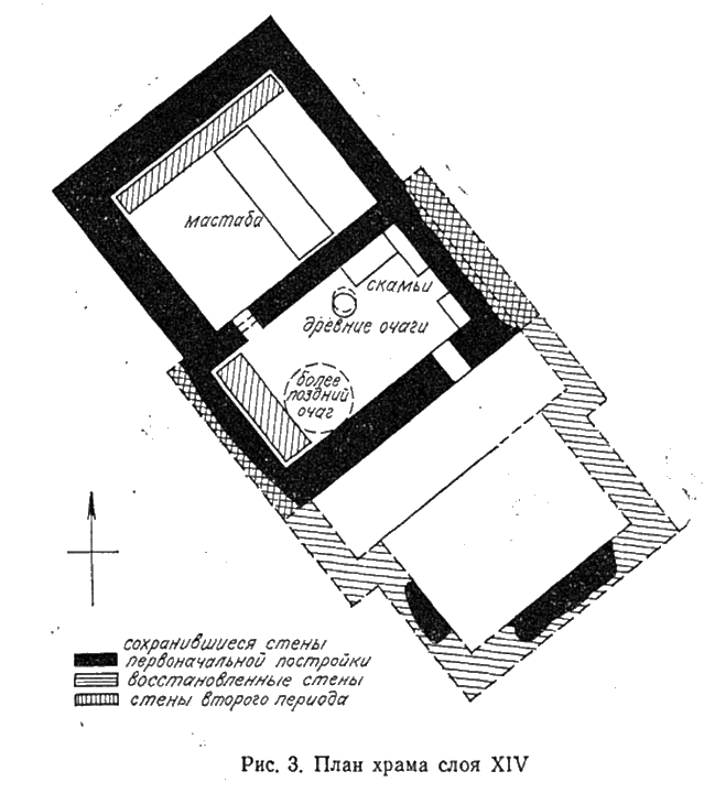 Эти радикальные изменения не означали, однако, полного отхода от традиции, поскольку в середине святилища, почти заполняя его, сохранялась старая «мастаба», относящаяся к слою XVI (рис. 3). Нижняя ее часть была теперь погребена под полом, но она по-прежнему возвышалась на четыре или пять футов. Это было единственное сооружение в святилище, по существу построенное вокруг него, и нам остается только предположить, что своим священным характером помещение было обязано присутствию в нем этой древней реликвии. Но связь с прошлым заключалась не только в ней одной. Другая важная особенность храма слоя XVI — любопытное сооружение, возле которого сжигали жертвоприношения; оно унаследовано от прошлого. Это сооружение помещалось на юго-восточном конце двора, и массивный фасад нового здания перекрывал его так, что и следов не было заметно, но тем не менее общий принцип расположения жертвенника для сожжений был сохранен, и в первой комнате мы нашли большую печь или очаг против внутренней стороны фасадной стены, т. е. на юго-восток от «мастабы»; это позволяет предположить, что храмовой ритуал начинался с сожжения жертв, а затем производились какие-то действия во внутреннем святилище с кирпичной скамейкой. Такова была первоначальная планировка здания, но с течением времени важные перестройки придали ему несколько иной характер. К внутренней стороне задней (северо-западной) стены святилища была добавлена новая кирпичная кладка, столь толстая, что она полностью заблокировала проход между этой стеной и «мастабой». Одновременно все пространство между «мастабой» и северо-восточной стеной, было заложено кирпичом, что превратило его в большую платформу, которая поглотила половину комнаты. В переднем помещении такая же кирпичная кладка была добавлена к обеим боковым стенам, в результате их толщина была доведена до 17 футов; юго-западная кладка была ровная, но на северо-восточной имелась глубокая центральная ниша; широкая кирпичная скамья была пристроена к северо-западной стене. Утолщение стен потребовалось, очевидно, в связи с увеличением их высоты, и можно предположить, что храм приобрел вид величественной башни. Перестройка внутренних помещений и замена в святилище расположенного в центре возвышения массивной платформой в конце комнаты связаны, по-видимому, с изменениями в ритуале. Ниша в боковой стене внешней комнаты и скамьи вдоль стен создают впечатление, что комната превратилась в помещение для отправления культа. В то же время пол в обеих комнатах был поднят и открытый передний двор был вымощен кирпичом до более высокого уровня. Первоначально двор имел два уровня; перед фасадом храма он был на одной высоте с порогом входной двери, но на расстоянии 10 футов от стен понижался на 18 дюймов. Этот нижний пол был глинобитным в отличие от выложенного сырцовым кирпичом верхнего пола, идущего вдоль стены. Мы обнаружили, что эта более низкая часть двора наполнена (под кирпичной кладкой более позднего пола) мусором — пеплом, костями животных, осколками глиняных сосудов, отходами жертвоприношений. Конечно, не исключено, что мусор использовался здесь как основа для нового пола во время перестройки, но скорее всего он накапливался постепенно, так как обычно отходы от жертвоприношений сваливались тут же, на храмовом дворе. Для нас подобное отношение к с