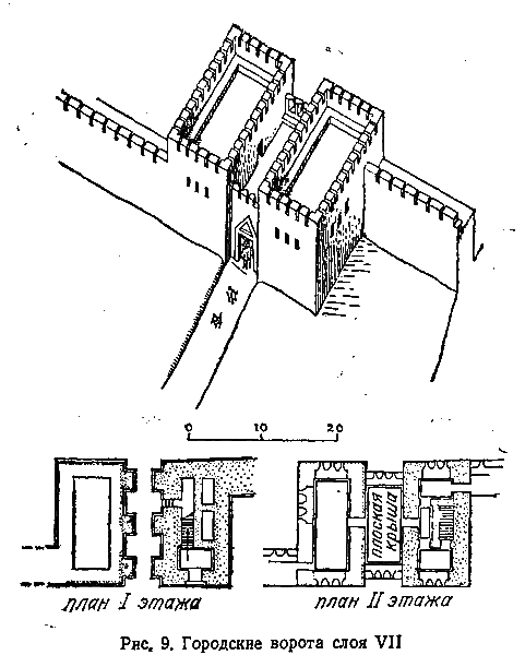 Раскопанные нами руины ворот, естественно, составляли только нижнюю часть сооружения, но они достаточно хорошо сохранились, чтобы можно было отчетливо представить себе общий его вид (рис. 9). В целом башня построена из сырцового кирпича; в качестве скреп использовались тяжелые деревянные балки. Это была кирпично-деревянная конструкция, характерная для сооружений хеттов. Фасад, как извне, так и изнутри, боковые стены дверного прохода и массивные контрфорсы трех ворот были облицованы белыми известняковыми плитами высотой четыре фута. Камни контрфорсов стояли не прямо, а с небольшим наклоном внутрь, как в воротах хеттской столицы Богазкей в Каппадокии. Там сводчатая арка над наклонными косяками имела выступ, что естественно, если строительный материал — камень, но здесь подобный эффект легко достигался кирпично-деревянными конструкциями, хотя можно смело предположить, что под фальшивой аркой была плоская гладкая перемычка. Одна сторона была цельная, представляя собой в действительности угол гигантского вала цитадели; во внутренней стене другой, северо-восточной, стороны имелся широкий проход с каменными косяками и ступенями, ведущими в караульное помещение. В задней части комнаты лестничный марш (нижние ступеньки выложены из кирпича, верхние — из дерева) вел в комнату над воротами и на верх городской стены. Под лестницей находилась маленькая комната с дверью, ведущей в промежуток между внешними и средним контрфорсами ворот, явно караульное помещение для стражи на посту. Это караульное помещение— любопытный просчет в тщательно продуманной планировке, так как врагу достаточно было захватить первую из трех больших дверей воротной башни, чтобы попасть в комнату стражи и, подпалив ее деревянное перекрытие, разрушить лестницу и, возможно, все сооружение. Похоже, что нечто в этом роде и случилось, ибо башня была явно уничтожена пожаром, караульное помещение выгорело, а кирпичные стены лестницы обрели под воздействием огня глубокий красный цвет; глиняный пол ворот был покрыт толстым слоем горелого дерева, служившего, вероятно, полом верхней комнаты: надвратная башня не оказалась неприступной. Мы не могли раскопать какую-либо городскую стену, но достаточно хорошо представляем ее характер. Царский дворец занимал угол города, и две его внешние стены фактически были и городскими стенами. Построенные из сырцового кирпича толщиной восемь футов, они возвышались над краем крутого земляного вала почти на 30 футов — высота определялась по разнице уровней пола дворца и плоскости равнины за стенами. Вал был явно земляным, а не кирпичным, как в цитадели, ибо все позднейшие валы были земляными, иногда с глиняной облицовкой. Здесь не было и бермы, а стены поднимались прямо от края откоса. Это подтверждается тем фактом, что внешняя часть северо-восточной стены дворца исчезла, съехав вниз по склону. Очевидно, в XVIII в. до н. э. Алалах мог считаться первоклассной крепостью, и там, где традиционно находился царский дворец, Ярим-Лим построил для себя новый дворец. Это было время (не единственное в истории Ближнего Востока), когда местные князья похвалялись друг перед другом роскошью своих дворцов. Так, правитель Угарита просит Ярим-Лима помочь ему увидеть дворец царя Ма’ер (Мари), о великолепии которого он был много наслышан. А царь Ямхада, как и Нер