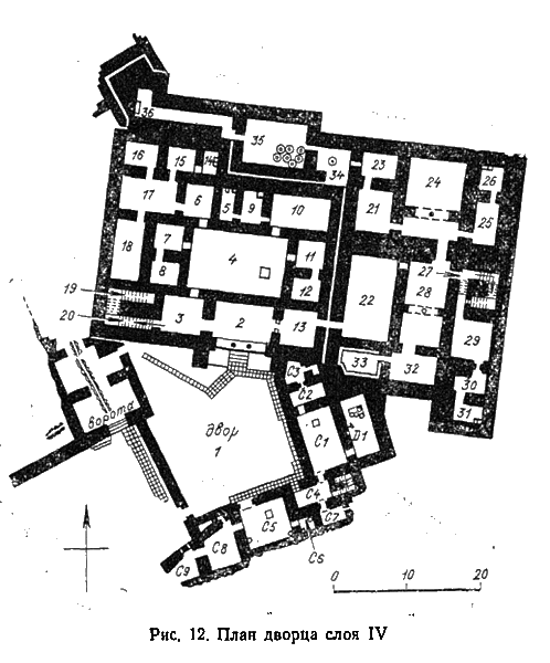 Наш археологический слой IV начинается несколько ранее 1450 г. до н. э., заканчивается около 1370 г. до н. э. и гораздо более полно, чем любой другой период, отражен в документах. Мы располагаем массой табличек, обнаруженных в царском дворце, и«автобиографией» царя Идри-ми, высеченной на его статуе. Археологические источники — это дворец, очень хорошо сохранившийся (рис. 12), остатки храма, большой участок внутри крепости, городские ворота с прилегающими строениями, много частных домов и более 40 могил[30], содержащих керамику и другие предметы. Во дворце помимо табличек обнаружено множество керамических изделий и предметов из слоновой кости и металла.