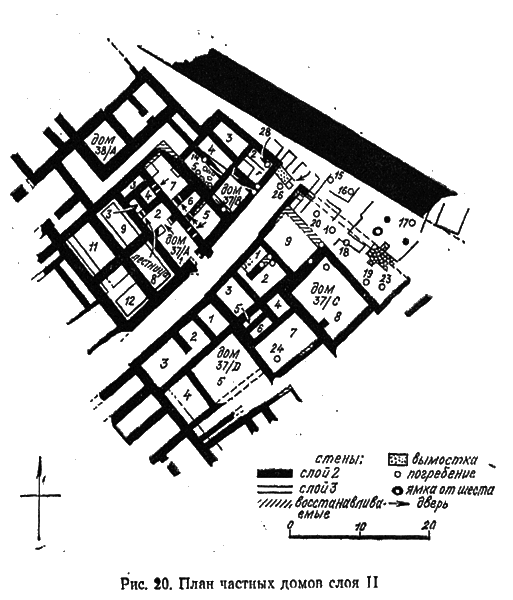 Мы убедились, что во всех десяти слоях, охватывающих период от VIII до IV в. до н. э., все сооружения весьма походили друг на друга (рис. 23, 24). Стены из сырцового кирпича укладывались почти всегда на каменный фундамент, иногда приподнятый выше уровня пола, что защищало от влаги; стены достаточно толстые, в среднем около двух футов, но нет оснований полагать, что какое-либо здание превышало один этаж — нигде никаких признаков лестниц не обнаружено. Полы были глинобитные, в нижних слоях наложенные на слой щебня — тоже мера против влажности почвы. В более высоких слоях, где здания значительно поднимались над уровнем равнины, необходимость в щебенке отпала, поэтому она не использовалась. Черепицы нигде не было, и крыши должны были быть такими же, какие по сей день характерны для мусульманских домов, — почти плоские, они состоят из слоев циновок, тростника и земли, положенных на близко лежащие тополевые жерди. Строения образуют блоки, почти квадратные и приблизительно одинаковые по размеру. Между ними улицы и проходы, пересекающиеся под прямым углом; они вымощены гравием, часто со стоками в середине; покрытие из каменных плит образует тротуар; на некоторых участках проезжей части имеются небольшие нарушения общей планировки, связанные, очевидно, с прихотями владельцев домов, но таких случаев немного. Внутри блоков, или «островков», отмечается не то чтобы полное единообразие, но нечто, наводящее на мысль о строительстве по какому-то стандартному плану. Широкий. проход вел с улицы во двор с рядом помещений вдоль стен — самое большое в центре, а по бокам более мелкие, и четыре более или менее квадратные комнаты за задней стеной двора; иногда очень маленькое отдельное строение стоит в центре двора. Таково главное строение блока, а оставшееся пространство занимали ряд или ряды маленьких комнат, идущих вдоль улицы и не имеющих связи с основным строением или друг с другом.