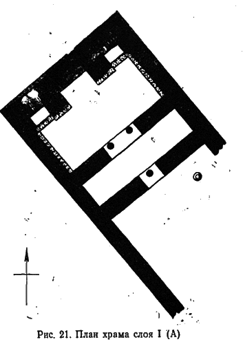 Храм слоя II был разрушен, и на обломках старых стен был положен новый каменный фундамент — тяжелые необработанные блоки весом в среднем полтонны каждый, затем отшлифованные базальтовые плиты и выше — стены из сырцового кирпича и дерева. Размеры здания были прежними, но цокольный план отличался от старого (рис. 21). Здание состояло только из двух комнат. С переднего двора, где помещался замечательный по конструкции, выложенный кирпичом колодец, имелся вход в прихожую. Судя по ширине прохода в восемь футов, можно предположить, что в центре стояла колонна. Напротив первого входа был расположен вход в святилище 14,4 фута шириной, разделенный посередине двумя колоннами[43]. В задней стене святилища, были три ниши: центральная — на одной линии с входом в святилище, открытая, с деревянными панелями; две другие были скрыты базальтовыми плитами, слегка отодвинутыми вглубь от края контрфорсов. Я не знаю, чтобы где-нибудь еще встречались такие скрытые ниши, которые, разумеется, мы обнаружили пустыми. Юго-западная ниша была разрушена до пола, а в кирпичной кладке за северо-восточной нишей обнаружен вмурованный бронзовый нож, сосуд из полихромного стекла, алебастровая ваза и немного керамики — все это можно считать закладными дарами при строительстве; мне кажется, что в нишах хранились подношения, принесенные в храм во время постройки.