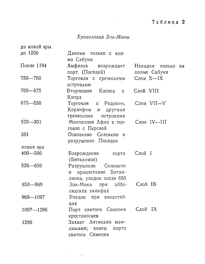 Затем в течение 400 лет место, где находился Посидей, было заброшено, и название города исчезло из памяти. Когда в I в. н. э. углубили фарватер нижнего течения Оронта и сделали его пригодным для навигации небольших судов вплоть до Антиохии, в устье реки были построены несколько строений, таможня и прочие здания, и к IV в. все это превратилось в маленький морской поселок, ибо два позднеклассических писателя упоминают о расположенной вблизи Селевкии естественной гавани, называвшейся Битиллион, которая не могла быть ничем иным, кроме нашей Эль-Мины. И действительно, мы нашли остатки строений, которые можно отнести к V–VI вв. н. э. Одно из них заслуживает внимания, так как имело каменную перегородку и аркаду с резными базами для колонн; на одной из каменных глыб был вырезан двойной крест, напоминая о том, что Антиохия в то время была одним из главных центров христианства. Более того, найденные здесь монеты Юстина, Юстиниана и Гераклия свидетельствуют, что в V в. и позднее старая гавань вновь ожила. Это было естественно: в 526 г. н. э. сильное землетрясение разрушило Селевкию, а последующие толчки в течение века довершили разрушение Селевкии и Антиохии; последняя несколько оправилась, но гигантские искусственные сооружения Селевкии не могли быть восстановлены в век упадка. Горожане уменьшившейся Антиохии, отрезанные от моря, так как в результате землетрясения Оронт стал непригодным для навигации, не имели другого выбора, как только использовать старую гавань в устье реки. Но упадок Антиохии, естественно, повлиявший и на торговлю, определил Битиллиону короткую жизнь. Наши раскопки не дали ничего, что можно было бы отнести к концу VII и к VIII в. Но с середины IX в. и далее полученные нами материалы довольно обильны: это остатки зданий, достаточно обширных, и масса керамики, в большинстве своем простой, но много и глазурованной, и расписной. Некоторые керамические изделия определенно местного производства, но имелось также и много образцов глазурованной керамики из Месопотамии, по-видимому предназначенной для экспорта за границу и доставленной в Эль-Мину транзитом. Словом, порт играл ту же роль, что и 2000 лет назад, но только теперь торговлю с Средиземноморьем вели аббасидские халифы Багдада и Самарры. До вторжения войск Византии в 969 г. н. э. ЭльМина процветала; затем опять пришла в упадок, так как захват Византией Антиохии прервал торговые отношения с Месопотамией, а у византийцев ничего не было для экспорта; мы нашли лишь 18 монет, относящихся к последующему периоду в 130 лет. Но в 1097 г. во время Первого крестового похода христианское войско овладело Антиохией, и в том же году генуэзский флот захватил Эль-Мину. Наступил еще один период процветания, а с 1188 г., когда Саладин захватил Латакию и южные области на сирийском побережье, единственный порт Эль-Мина, оставшийся в руках антиохийских герцогов, стал по-настоящему важным пунктом. На возвышенности, в миле от гавани, вырос город Сувайдия, гавань тоже быстро росла; за пределами наших раскопок можно было видеть массивные бетонные стены, молы и остатки зданий из прекрасного камня. Теперь эта гавань называлась порт святого Симеона в честь второго из этих странных аскетов, которые стяжали или проявляли святость, проводя жизнь на вершине высокой колонны. Монастырь и гробница святого венчают соседний холм. Найде