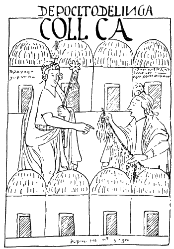 Рис. 1. Инка Тупак Юпанги слушает донесение одного из своих наместников (который читает его по кипу)