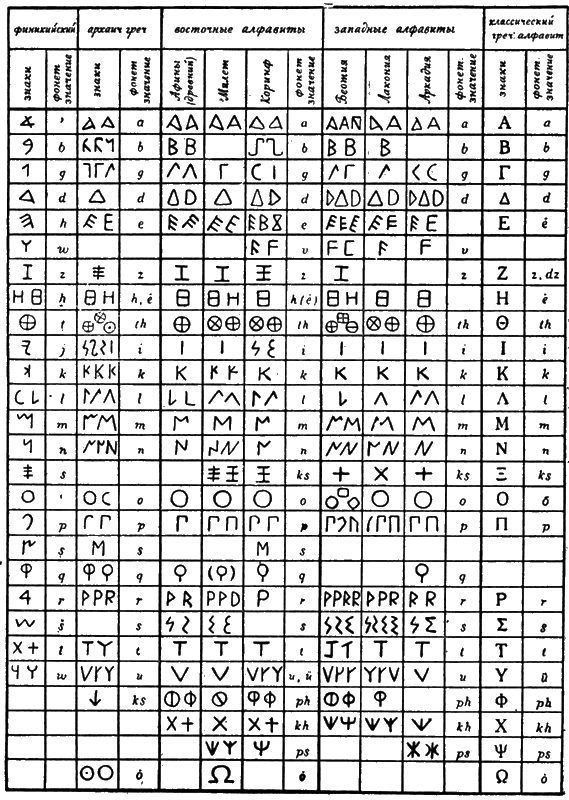 Рис. 12. Греческие алфавиты и их эволюция после заимствования знаков финикийского письма