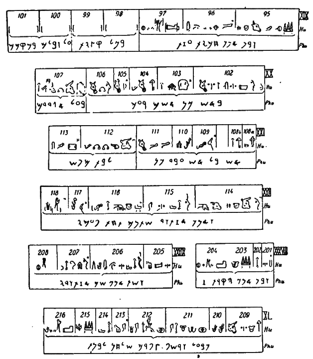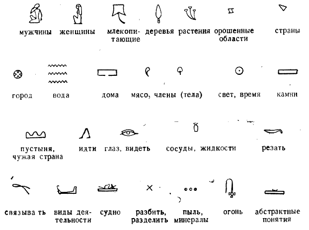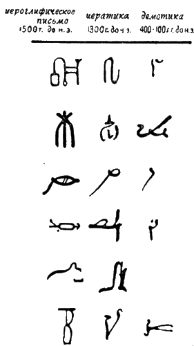 Обе эти ярко выраженные тенденции, одна — к четкому определению и фиксации значения знака-рисунка, другая — к упрощению и нормализации его внешней формы, побуждают письменность преодолеть ступень чистого слово-рисуночного письма. В процессе развития культуры знание и употребление письменности выходят за круг ее первоначальных обладателей и хранителей. Письменность неуклонно проникает в народную среду, и так же неуклонно растет потребность во все большем упрощении форм знаков; хочется писать легче и быстрее, и писчий материал, часто хрупкий, вносит свой вклад в дело упрощения знаков. В связи с этим рассмотрим предпринятое Иоганнесом Фридрихом сопоставление из области египетской письменности. Он сравнивает текст, из Папирусам Эберса, который написан более поздним иератическим («жреческим») письмом, с тем же текстом в иероглифической, транскрипции (рисунок 9).