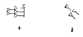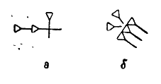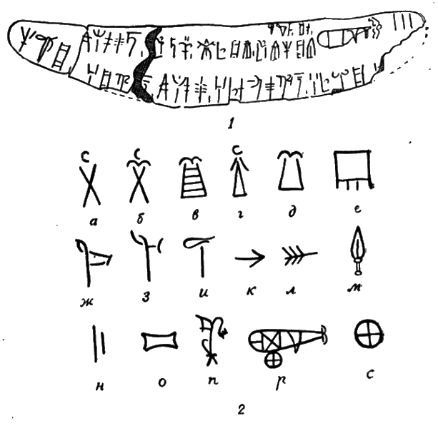 больше уже не означал «дом», «дворец», «сарай», а характеризовал лишь одно из этих понятий, например «дом». На данной ступени развития, следовательно, в высшей степени четкому и узко очерченному содержанию значения соответствует уже совершенно определенный общеупотребительный знак. Подобное письмо, как и примитивные рисуночные письмена, может передавать не только конкретные предметы и события, но и абстрактные понятия, используя для этого символические знаки, и в то же время оно имеет перед чистой пиктографией и чистой идеографией такое преимущество, как недвусмысленность. Оно могло бы быть слово-рисуночным письмом в наиболее чистом виде. «Могло бы быть», поскольку оно нигде в таком виде не встречается, если, конечно, вслед за Йенсеном не причислить сюда южнонегритянское письмо нсибиди, открытое в 1905 году у негритянских племен ибо и эфик. Из знаков этого письма приведем в качестве иллюстрации к слово-рисуночному письму рассматривавшийся исследователями знак для выражения понятия «семейная ссора»; он выглядит так: