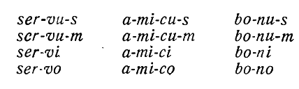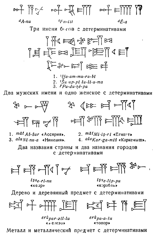 , которые по чисто техническим соображениям он транскрибирует через A, U и Y(Ψ) (сразу же отметим, что из этого вовсе не следует, будто он придавал вышеприведенным знакам звуковые значения а, и и i. или ps). Теперь основываясь на своей интерпретации данных археологии (печати — это документы административного учета, своего рода «приходные накладные» без упоминания собственных имен), Мериджи прежде всего переходит к поискам в надписях трех падежей. Один из них — именительный — должен указывать предмет, о регистрации которого идет речь, другой — родительный — должен указывать владение, собственность (или в форме родительного разделительного — количество) и, наконец, третий — дательный — должен был бы служить для указания цели или ^назначения названного предмета. Окончания именно этих трех падежей и выражены, по его мнению, в трех упомянутых знаках (А = именительный, U = родительный, Ψ = дательный).