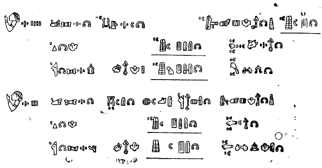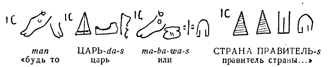 Таков обрисованный в принципе ход. общих, основанных на объективных данных, рассуждений Мериджи. Эти рассуждения привели его к предположению о наличии в надписях как раз тех связей, которые в грамматике выражаются именительным, родительным и дательным падежами. Оставалось только подкрепить и проиллюстрировать основные положения другим компонентом, а именно — объяснением отдельных знаков. Здесь профессор Мериджи, придерживаясь наиболее близкого и доступного толкования значений некоторых рисуночных знаков, попытался на базе этих значений логически и грамматически связать уже целые группы знаков.