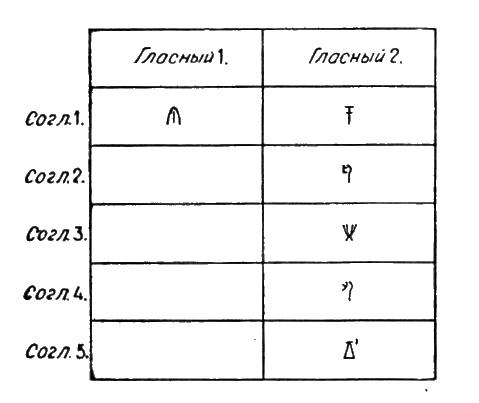 , довольно часто встречавшаяся в обеих орхонских надписях. Отправным пунктом исследования являлся здесь последний, четвёртый, знак группы (как раз крайний слева, поскольку направление письма — справа налево),