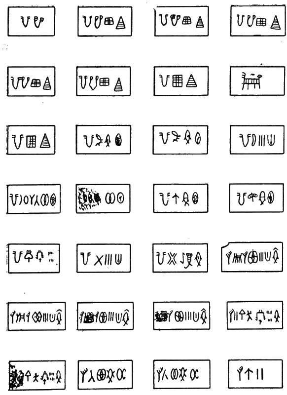 Разумеется, эти значения, производные от рисуночного характера знаков, оправданы лишь в известной мере. Однако есть одно обстоятельство, которое, по-видимому, еще более подтверждает правильность такого понимания текстов. Куда бы мы ни подставили предложенные Мериджи значения, они везде оказываются к месту хотя бы уже потому, что в своих сочетаниях не противоречат здравому смыслу. Более того, содержание всех надписей, которое получено в итоге реализации принципов Мериджи, относится к одной и той же области понятий, а именно — области четко выраженной сельскохозяйственной терминологии; от зерна, семян и бобовых до косы и мотыги, мельницы и ступки.