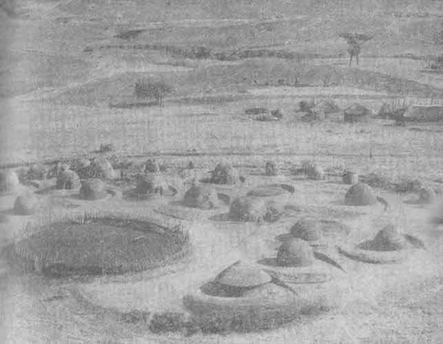 Катастрофа 1904 г. не только подорвала основы существования гереро, лишив многочисленных стад скота, но и уничтожила их культуру. К числу крайне скудных источников по истории гереро относятся весьма тенденциозные сообщения офицеров немецких колониальных войск того времени, когда гереро уже не могли вести привычный образ жизни и были вынуждены постоянно отступать. Газета «Дейчес Колонна льблатт» 1 октября 1909 г. поместила следующее сообщение некоего лейтенанта фон Герсдорфа: «Там, где гереро не опасаются патрулей, они возводят свои понтоки[52] и верфи[53] примерно в 5–6 километрах от воды. Остовом понтокам служат сучья и ветви, согнутые сводом наподобие пчелиного улья и связанные древесной корой. Сверху их покрывают травой. Все имущество гереро состоит из колод, выдолбленных из дерева, — в них они толкут клубни водянистого растения, чтобы получить жидкость, которую затем перемешивают с ягодами, — из топора, шила, банки с трутом, кремня и огнива. Трут гереро добывают из гнилушек или древесных наростов; из старых кусков железа они выковывают наконечники для стрел и копий, мастерят капканы. Одежду, а часто также и обувь гереро шьют из дубленых козлиных шкур. Дети их бегают совершенно нагими. В кожаные сумки вроде наших ягдташей гереро собирают съедобные корни, которые выкапывают из земли обожженной на костре палкой. Мужчины прибегают для этого также к помощи палицы с заостренным концом, основное назначение которой — приканчивать животных, попавших в капкан или силки. Кроме палицы, гереро вооружены копьем и луком. Отравленными стрелами они не пользуются, хотя знают состав яда,изготовляемого бушменами. Гереро плетут силки из веревок — материал для них дает агава определенной разновидности — или же из проволоки. Сбор корней и снабжение водой — дело женщин и детей, на обязанности мужчин лежит охота. В сухое время года для многих гереро только клубни водянистого растения служат источником влаги. В местностях, отдаленных от воды, они строят свои поитоки там, где изобилует это растение. Гереро запасают его в большом количестве, и, чтобы предохранить от высыхания, закапывают в песок. Перед употреблением его клубни очищают, разрезают на мелкие куски и растирают в деревянных колодах. Полученную кашицу выжимают руками. Собаки не переносят этой жидкости и дохнут от нее. Людям она также не безвредна, гереро нередко заболевают и в качестве лечения прибегают к кровопусканию, делая разрез в ушах. Зато жидкость, получаемую из растения тсама, и люди и животные могут пить длительное время без ущерба для здоровья. Однако в песчаных местностях это растение встречается крайне редко. В наиболее засушливые периоды гереро, чтобы спастись от жажды, подвешивают на дерево желудок каменного козла, который содержит до трех котелков жидкости, а снизу подставляют горшок. Пользуются они и другим — ускоренным — способом, при котором получается менее чистая влага: желудок вскрывают, руками выжимают в сосуд его содержимое, а затем пропускают через травяной фильтр, после чего используют для питья и для варки пищи. Каждое утро на рассвете женщины и дети отправляются за водой или на поиски корней, а мужчины осматривают ловушки и «охотничьи краали». Ловушки представляют собой ямы шириной 1,5 и глубиной 1,5–2 метра, выкопанные большей частью вблизи солончаков, по нескол