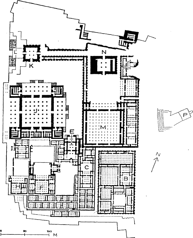 А — лестница на террасу; В — «Ворота Всех стран»; С — ападана; D — Дворец D; Е — Тройной портал; F — Дворец Ксеркса; G — Дворец G; H — Дворец II I — Дворец Дария I; j — незавершенные ворота; К — Тронный зaл; L — сокровищница; М — кладовые; N — конюшни и гарнизонные помещения; О — крепостная стена, Р — гробница Артаксеркса II