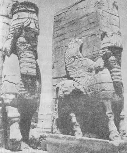 Сразу же за монументальной лестницей вы оказываетесь перед довольно хорошо сохранившимися воротами, именуемыми в текстах «Ворота Всех стран» (на плане обозначены буквой В). Прямо против лестницы расположены огромные фигуры крылатых быков. Их туловища выдаются вперед на фоне массивных каменных плит. Такого же типа скульптуры украшают противоположную сторону, где над четырьмя быками можно прочесть одинаковые трехъязычные надписи в двадцати четыре строки. Они гласят: «Я — Ксеркс, великий царь царь царей, царь многих стран, царь всей земли, про стирающейся вдаль и вширь. По воле Ахурамазды я еде лал эти «Ворота Всех стран». Я и мой отец построил! в этом [городе] Парсе [и] много других прекрасны; [зданий]. Все прекрасное, что построено [здесь], все это мы совершили по воле Ахурамазды». Были также надписи, относящиеся к более позднем; времени. В 1818 г. Кер Портер писал: «К сожалению на обеих сторонах я обнаружил массу инициалов, имен и дат, сделанных посетителями, которые нанесли большой ущерб поверхности камня».