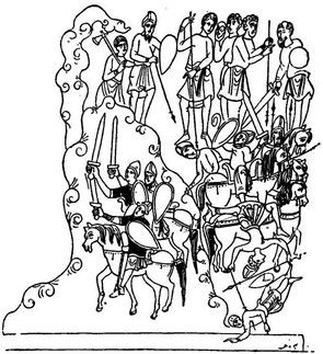 Воодушевив их такими речами, он, будучи человеком храбрым и сильным, атаковал варваров с 16-тыс. войском, подняв знамена. Вперед он послал пехоту, чтобы она нанесла первый удар. Сам же стал во главе конницы, выжидая, как решится судьба пехоты. Варвары тоже выстроились рядами и замышляли напасть на противника, пока тот строится. Враги бросились на королевскую пехоту, осыпав ее стрелами, затем, уставив пики, ринулись на них. В схватке с варварами многие погибли, но нанесли ущерб противнику. Ибо и с их стороны были убитые и гораздо больше раненых. За пехотой и королевская конница с силой обрушилась на вражеские ряды, поколебленные пехотой. Рассказывают, что там полегло 13 тысяч[35], немногие спаслись бегством. И когда победа была уже обеспечена и предстоял раздел добычи, четыре тысячи варваров, которые коварно затаились в укрытии, напали с боковых дорог. Они постепенно приближались, но дозорные заметили блеск их оружия и дали сигнал к сбору войска. Король, думая, что приближается гораздо больше врагов, убеждал своих вернуться в прежнее состояние духа и не терять его, объявив в длинной речи, что умереть за родину — подвиг, и честь — пожертвовать собой ради защиты христиан. Итак, войско собралось, и хотя много было раненых и увечных, никто не отказался идти вперед.9. Незнатный Ингон идет в бой с королевским знаменем