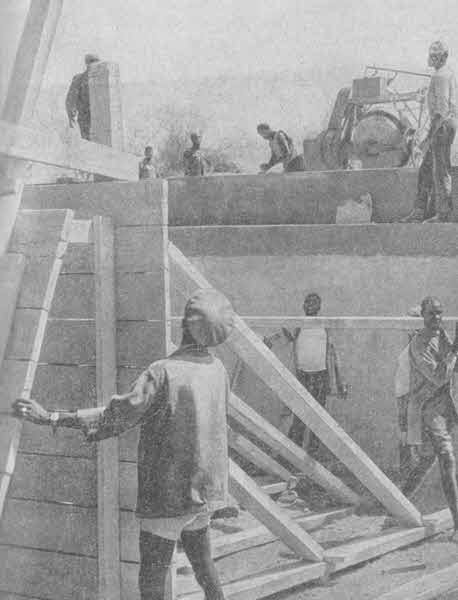 Гигантская плотина поднялась над рекой, сверкая своими стальными балками, опирающимися на ослепительно белые быки. Постепенно сужаясь, плотина превращается вдали в точку. 816 метров в длину — это одна из самых длинных дамб в мире. С какой целью было задумано здесь, в африканской колонии, строительство гигантской плотины — этого грандиозного творения человеческих рук, сделавшего просторный и дикий ландшафт Нигера строже и цивилизованней? Возникнув сначала лишь для того, чтобы еще глубже ввергнуть народ в рабство, теперь этот символ победы вознесся вверх для того, чтобы сделать молодую, еще не осознанную свободу реальной и ощутимой. Окружающие внимательно и молча наблюдали за иностранцами. Наконец один из них начал рассказывать. Да, плотину строили французы, и 1в 1947 году она была уже готова; но когда они вынуждены были убираться восвояси, пришлось взять ее под защиту и охранять от тех, кто соорудил ее. Нужно было помешать им взорвать плотину в последние дни. С этих пор день и ночь регулярная полиция и бригады бдительности охраняют народное достояние. «Разве мы знаем, что задумали империалисты? Разве они стали теперь лучше? Мы защищаем нашу плотину, ибо, как вы увидите, она многое нам дает». Многое дает… Плотина на Нигере возле Маркалы превращает реку в море; здесь берут свое начало два канала. Один из них — Сахельский — направляет воду прямо на север пустыни, другой — Масинский — идет на восток. В этом месте воды Нигера переводятся при помощи стрелок; укрощенные искусством человека, они поставлены ему на службу. Едва солнце поднялось немного выше, как оно стало уже нам докучать. Первые часы после восхода — лучшее время дня — пролетели быстро. Впервые в Африке, невдалеке от плотины, вступили мы на залитый ярким светом фабричный двор, осмотрели душные цеха и контору. Мы видели африканских рабочих: клепальщиков, сварщиков, токарей, слышали визг металлических пил и удивлялись, как мало все это нас поражает. Фабрика, рабочие — такие же, как и миллионы других в мире. И все же здесь было несколько иначе, чем где-либо: 350 рабочих этого предприятия принадлежали к тому единственному проценту рабочего класса, который имелся в Мали после завоевания независимости. Они были все без исключения рабочими первого поколения; каждый из них пришел из крестьянской хижины, каждому с детства было известно единственное орудие труда — мотыга с короткой ручкой. Возможно, как раз по-этому-то и смотрел так гордо из-за токарного станка на нас, гостей, молодой токарь, который только что сунул в рот сигарету. Механические мастерские в Маркале были созданы во время второй мировой войны не для того, чтобы сделать наконец жителей берегов Нигера современными людьми, допустив их к работе на современных машинах; нет, они возникли в результате затруднительного положения, в котором оказались колониальные власти. В то время Франции становилось все труднее снабжать свой растущий полип «Оффис дю Нижер» запасными частями для агрегатов и отправлять машины для ремонта во Францию. Первоначально ремонтный завод был создан в качестве временной меры, что заметно на заводе еще и сегодня: производство было мелким, но многоотраслевым. И это старое сочетание сохранилось на новом заводе. Сегодня здесь ремонтируют тракторы, автомобили, сельскохозяйственные машины, электроприборы; 