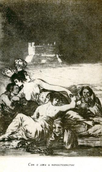 Офорты, которыми Франсиско занимался в последние месяцы, были переработкой эскизов, сделанных им в блаженную санлукарскую пору. Но беспечно-жизнерадостные рисунки тех времен вместе с новой формой приобрели и новый смысл: стали глубже, острее, злее. Каэтана уже не была только Каэтаной. Из-за дуэньи Эуфемии проглядывала умершая камеристка Бригида. Камеристка Фруэла, танцовщица Серафина стали мадридскими махами в самых разнообразных обличьях. И сам он, Франсиско, являлся в самых разнообразных обличьях: то неуклюжим любезником, то коварным махо, но чаще всего обманутым мечтателем, неделе. Так возник альбом причудливых, ни на что не похожих картин, изображавших все, что приключается с женщинами города Мадрида: чаще худое, а иногда и хорошее. Они выходят замуж за уродливых богачей, они заманивают влюбленных простаков, они обирают всякого, кого только можно обобрать, а их самих обирают ростовщики, стряпчие, судьи. Они любят и любезничают, щеголяют в соблазнительных нарядах и, даже одряхлев, став страшилищами, глядятся в зеркало, рядятся и румянятся. Они горделиво прогуливаются и катаются в пышных каретах иди, жалостно съежившись, сидят во власянице перед инквизитором, томятся в темнице, стоят у позорного столба, их ведут к месту казни, обнажив для посрамления до пояса. И при этом их неизменно окружает рой распутных щеголей, грубиянов полицейских, грозных махо, лукавых дуэний и сводниц. И демоны роятся вокруг них: не только умершая Бригида, но целые полчища призраков, иной раз добродушных, по большей части пугающих и почти всегда фантастически уродливых. И все это двусмысленно, все зыбко, все меняется перед зрителем. У невесты из свадебного шествия — второе, звериное лицо; старуха позади нее превращается в омерзительную мартышку; из полумглы многозначительно скалятся зрители. А вожделеющие и домогающиеся мужчины со знакомо-незнакомыми лицами вьются вокруг, точно птицы, падают, их ощипывают в прямом смысле слова и, ощипав, выметают прочь. Жениху показывают составленный без сучка, без задоринки перечень высокородных покойников — предков нареченной, он изучает перечень, но до поры до времени не видит обезьяньего лица живой невесты. Не видит себя и она. Каждый носит маску и даже себе самому кажется тем, чем хочет быть, а не тем, что он есть в действительности. Никто никого не знает, никто не знает себя. Вот над какими рисунками самозабвенно, с остервенением и подъемом работал в последнее время Франсиско. Но после отставки Ховельяноса воодушевление испарилось. Он сидел сложа руки в своей эрмите, разговор в доме дона Гаспара не шел у него из головы, мысленно он спорил с бывшими там друзьями. Чего, собственно, они хотят от него? Чтобы он присоединился к разным проектистам и показывал прохожим на Пуэрта дель Соль крамольные картинки? Как все эти Ховельяносы и Кинтаны не понимают, что жертвы бесполезны? Вот уж триста лет идут они на мучения, на пытки, на смерть во имя одной и той же цели. А чего они добились? Пускай старик сидит себе посиживает в своих астурийских горах и ждет, пока за ним не явится зеленый гонец инквизиции, — ему, Франсиско, не затуманишь мозги дутым героизмом. «A tuyo tu — всякому свое!» Но он никак не мог отмахнуться от того, что говорилось у Ховельяноса. Он вспоминал дона Мануэля, в ленивой, пресыщенной и вызывающей позе развалившегося 