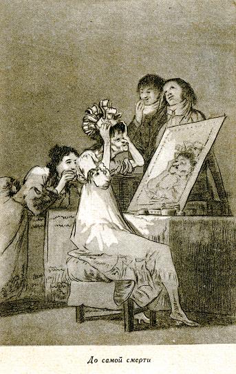 Гойя очень считался с тем, какое впечатление его работа производит на людей. Увидев, что друзья, несмотря на искреннее желание и живейший интерес, не поняли целый ряд «Капричос», он отложил в сторону самые неясные и личные по содержанию, а остальные попытался расположить так, чтобы они образовали некое единство. Начал он с тех листов, на которых были запечатлены вполне ясные события и положения. За этими рисунками из раздела «Действительность» шли офорты, изображающие привидения и всяческую чертовщину. Такой порядок облегчал правильное понимание целого. Мир действительности подводил к миру духов, а этот второй раздел, где царили призраки, давал ключ к первому, говорившему о людях. История его собственной жизни, отраженная в «Капричос», эта фантасмагория любви, славы, счастья и разочарований, при таком расположении приобретала истинный свои смысл, становилась историей каждого испанца, историей Испании. Разделив, подобрав и сложив листы, он стал придумывать для них названия. В самом деле, порядочному рисунку, как и порядочному христианину, подобает носить имя. Он не был писателем: зачастую ему приходилось подолгу искать точное слово, но это особенно увлекало его. Когда название получалось слишком бледное, он прибавлял к нему коротенькое толкование. В конце концов под каждым листом, кроме подписи, оказалось и пояснение. Иногда название было вполне скромным и невинным, но тем забористее получался комментарии, иногда же рискованное название уравновешивалось простодушно-назидательным истолкованием. Тут было все вперемешку: поговорки, злые и острые словца, безобидная деревенская мудрость, квазиблагочестивые изречения, ехидно озорные намеки, полные глубокого смысла. «Тантал» — такое название дал он рисунку, на котором любовник горюет над мертвой, исподтишка наблюдающей за ним возлюбленной, и высмеял самого себя, пояснив: «Будь он поучтивее и повеселее, она бы воскресла». «Никто себя не знает», — подписал он под «Маскарадом», а под старухой, которая ко дню своего семидесятипятилетия усердно рядится в богатые уборы, он начертал: «До самой смерти». Рисунок, где на маху наводят красоту, меж тем как сводня Бригида, перебирая четки, читает молитву, он пояснил так: «Эта с полным основанием молится за то, чтобы господь даровал ей счастье, избавил ее от скверны, от цирюльников, от врачей, от судебных исполнителей, дабы стать ей искусной, бойкой и всем угождать не хуже покойной ее матушки». Под офортом, на котором секретарь священного трибунала читает приговор незадачливой шлюхе, он написал; «Ай-ай-ай! Можно ли так дурно обходиться с честной женщиной, которая за кусок хлеба с маслом усердно и успешно служила всему свету!» А тот офорт, где ведьма, сидя на закорках у сатира, дает кощунственный обет душам праведников, он истолковал так: «Клянешься ли чтить наставников и пастырей своих и повиноваться им? Клянешься ли выметать амбары? Звонить бубенцами? Выть и визжать? Летать, умащать, высасывать, поджаривать, поддувать? Делать все, что бы и когда бы тебе ни приказали? — Клянусь. — Отлично, дочь моя, нарекаю тебя ведьмой. Прими мои поздравления». Долго обдумывал он, какой лист сделать первым. Наконец решился открыть цикл тем рисунком, на котором он сам упал головой на стол и закрывает глаза от привидений. Этот офорт он назвал «Всеобщий язык». Но такое н