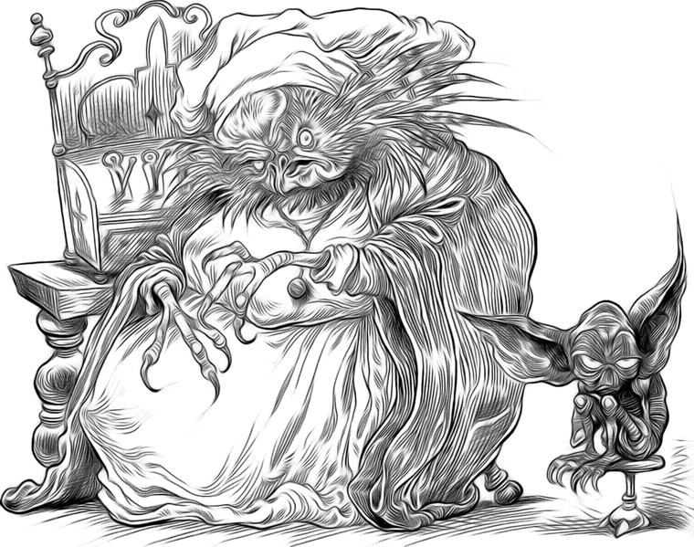 Необычные для Личного Святилища звуки раздавались под его позолоченными лепными сводами: кто-то мурлыкал себе под нос. И хотя эти звуки не отличались мелодичностью, они вполне определенно были исполнены радости и ликования. Слугам – а тех, кто обслуживал Личное Саятилище и его важного обитателя, было немало – настоятельно рекомендовалось поддерживать тишину. А к любого рода музицированию, будь то мурлыканье, пение или насвистывание, относились крайне неодобрительно. Всего неделю назад старина Джарвис – преданный слуга, прослуживший верой и правдой сорок сроков, – был пойман за напевавшем себе под нос колыбельной песенки. (Он недавно стал пра-прадедушкой.) За эту провинность ему немедленно отказали от места. Но сейчас, однако, напевал не слуга. Звуки вылетали из-под пухлого носа Высочайшего Академика Санктафракса, ибо Вилникс Подлиниус испытывал довольство собой сверх всякой меры. – Хмм, хмм, хммм. Пам-пам-пам-пам, – не умолкал он, занимаясь делами. – Пам-пам-пам… – Тут он замолчал и хихикнул, когда в его сознании всплыли подробности вчерашнего разговора. Он ужинал вместе с Сименоном Зинтаксом, и какой полезной для него оказалась эта трапеза!