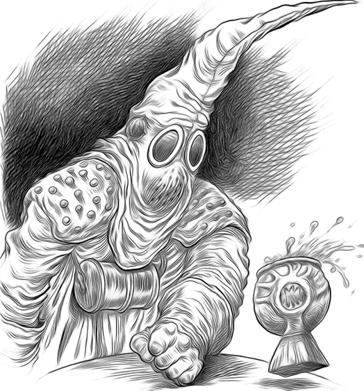 – Сюда, – сказал Слич, резко остановившись у ветхой лачуги. Он отпер дверь и исчез внутри. Сопровождавший последовал за ним. Он закрыл дверь и подождал, пока крохгоблин найдет и зажжет лампу. – Честное слово, – вздрогнул Слич, когда обернулся при бледном свете лампы, наполнившем комнату, – вы, душегубцы, действительно кроваво-красные. Тендон неуклюже зашаркал по комнате. – У тебя ведь есть пылефракс или как? – начал он. – А если нет… – Лучший пылефракс в Нижнем Городе, – заверил его Слич. – В потенциале. – В потенциале? – Я приобрел немного грозофракса на черном рынке, – объяснил Слич. – Все, что тебе нужно сделать, это растолочь его. Тендон невозмутимо посмотрел на Слича. – Ты, должно быть, думаешь, что я идиот, – произнес он наконец. – Грозофракс взрывается, когда его пытаешься растолочь. Это все знают. Только лишь его всемогущей светлости Академику известен секрет… – Я тоже знаю этот секрет, – убежденно проговорил Слич. Он достал с полки ступку и поставил ее на маленький стол. Затем вытащил из кармана сверток, аккуратно развернул его, и взорам обоих предстал блестящий и переливающийся огнями осколок грозофракса. Держа его двумя пальцами – большим левой руки и средним правой, ибо прочие отсутствовали, Слич мягко опустил осколок в ступку. Тендона все еще терзали сомнения: – А в чем секрет-то? – Вот в чем, – ответил Слич, доставая кожаный кошелек-мешочек из-за пояса. Он распустил шнурок, чтобы Тендон мог увидеть содержимое. – И что это? – Это порошок из коры сухостойного дерева, – объяснил Слич заговорщическим шепотом. – Самый лучший, который только можно достать. Тендон боязливо попятился. Этот порошок доктора Нижнего Города использовали как обезболивающее перед операцией. А Слич продолжал растолковывать: – Обезболивающее действие порошка нейтрализует взрывоопасность грозофракса. Взрыв, так сказать, парализуется. – Ты уверен в этом? – спросил Тендон. – О, ради Неба! – раздраженно упрекнул его Слич. – Разве ты не признавался мне, что тебе до смерти надоело тратить все заработанные тяжелым трудом деньги на питьевую воду? Разве ты не говорил, что сделал бы все что угодно, чтобы достать немного пылефракса? Уверяю тебя, что сухостойный порошок сработает! – Слич щедро насыпал порошка в ступку. – Взрыва не будет, и ты, мой друг, получишь столько пылефракса, что тебе хватит до конца жизни. Тендон нервно теребил амулеты, висевшие на шее. Однако, несмотря на опасения, он не смог устоять против соблазнительного предложения крохгоблина. Заплатив сто монет, как они и договаривались, Тендон взял пестик. Слич надежно спрятал деньги в карман, а затем со всех ног бросился в дальний угол лачуги, где за железной печкой сжался в комок. – Давай, бей! – закричал он. – Порошок сработает! И Тендон с размаху опустил пестик в ступку.