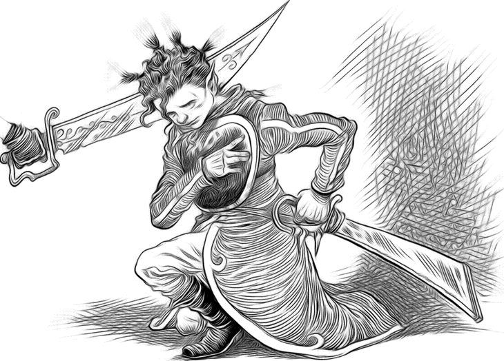 – Что?! – воскликнул Профессор. – Нашему достойнейшему руководителю Вилниксу Подлиниусу никогда бы и в голову такое не пришло. Поэтому дай мне пройти. Сейчас же! – Никто не может пройти в казначейство, – сказал Тугодум, внезапно рассвирепев. – Ни член Лиги, ни академик! – Он поднес свой фонарь к лицу Профессора. – И в особенности вы! Таково распоряжение самого Вилникса Подлиниуса. Более того, вам придется сдать ваш ключ. – Сдать ключ? Только через мой труп! – вышел из себя Профессор. – Если вам хочется, то так тому и быть, – последовал леденящий душу ответ. Лампа с грохотом опустилась на землю, и Прутик услышал лязг вынимаемых из ножен меча и кинжала. Через плечо Профессора он вгляделся в стражника, преградившего им путь. «Плоскоголовый, – пробормотал он про себя. – „Я мог бы и догадаться об этом“. Прутик разглядел стоявшего с важным видом гоблина, у которого блестели серьги в ушах, золотые зубы во рту и клинки в руках. Да как смеет этот грубый варвар, этот плоскоголовый урод стоять у них на пути? – Мой дорогой Тугодум, – начал Профессор. – Все это, должно быть, какое-то недоразумение. Если бы ты только на минуточку впустил нас в казначейство. Никто бы никогда об этом и не узнал… Тут ярость Прутика вырвалась наружу. Он выхватил меч из ножен и выпрыгнул вперед. – А ну дай нам пройти, придурок! – взревел он. На миг плоскоголовый растерялся, но только на миг. Злобно ухмыляясь, он выпрямился и сделал резкий выпад, направляя удар в шею. Прутик мгновенно сделал шаг назад и отразил удар. Раздался яростный звон мечей, и Прутик, сметенный мощью противника, отступил. В тот же миг Тугодум оказался рядом, свирепо орудуя мечом и кинжалом. Прутик задрожал под стремительным натиском посыпавшихся на него ударов. Задыхаясь и пошатываясь, он отступал и защищался как мог, слабея с каждой секундой. Внезапно плоскоголовый прыгнул вправо и своим тяжелым мечом нанес удар слева, застав Прутика врасплох. Мальчик отскочил в сторону и ударился локтем о стену. – А-а-а! – завопил он, когда жгучая боль пронзила руку. Меч со звоном упал на каменный пол. Глаза у Тугодума загорелись.