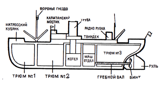 В трюме № 1 — хранился запас продуктов на полтора года, ведь каждый иногда думал: «А что, если…» В трюмах № 2 и 3 — уголь самого лучшего качества. Только его все равно мало и по дороге ледокол должен обязательно подкармливаться углем. Капитан Воронин говорил, что нас будет ждать уголь на Диксоне и в Тикси. Капитанский мостик — место, откуда капитан иногда не спускался по сорок часов. Чаще всего они стояли там вместе — Отто Юльевич и капитан Воронин. Воронье гнездо — бочка, прикрепленная к мачте. Она есть на каждом ледоколе и даже была на парусниках. В нее капитан забирался, когда кругом были ледяные поля и трудно было найти проход между ними. Матросский кубрик — в нем жили матросы. Их называли «палубная» команда. Кочегарский кубрик — там жили кочегары и механики. У них была хорошая баня и душевые кабины. Твиндек — там были лаборатории и жили несколько научных работников. Мы жили под твиндеком в трюме № 3. Верхнюю часть трюма отгородили и построили каюты. Там была и кают-компания. Труба — из нее иногда поднимался черный дым. Труба — самое любимое место. Около нее было тепло, за ней можно было спрятаться от ветра. Там всегда собиралась компания шутников и рассказчиков. Радиорубка — хозяйство Кренкеля. В нее без разрешения лучше было не входить. На схеме нет скотного двора. Он помещался на палубе под брезентовой крышей. Все наше плавание сопровождалось коровьим мычанием и петушиными криками.