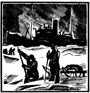Еще смену мы работали, и к вечеру весь уголь был перегружен. Он уже давно не помещался в трюме, а лежал большой грудой на носу. Но лопасти были все-таки под водой. Последний груз, который я переносил на нос, были свиные окорока — сорок штук. — Шабаш, — скомандовал Лимчер, — мыться и спать всю ночь. Но я не мог заснуть. Я спустился на лед и подошел к корме. Корма была высоко. Внизу плескалась вода. Мелкие снежинки падали на нее и очень медленно таяли. Вода была совершенно черной. Я старался разглядеть наши лопасти, присел на корточки и долго вглядывался. Одну наконец я увидел. Она была вся истерзана. Острые обломанные зубцы торчали у нее в разные стороны, как у неаккуратно вскрытой консервной банки. Корпус корабля тоже был сильно ободран льдами. И вмятины на нем виднелись. Но мы победили. Завтра поставят новые лопасти, и мы пойдем дальше.НОВЫЕ ЛОПАСТИ