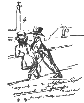 Было около четырех часов. Выпив стакан лимонаду или воды, Данзас не помнит, Пушкин вышел с ним из кондитерской; сели в сани и отправились по направлению к Троицкому мосту. Бог весть, что думал Пушкин. По наружности он был покоен… Конечно, ни один сколько-нибудь мыслящий русский человек не был в состоянии оставаться равнодушным, провожая Пушкина, может быть на верную смерть; тем более понятно, что чувствовал Данзас. Сердце его сжималось при одной мысли, что через несколько минут, может быть, Пушкина уже не станет. Напрасно усиливался он льстить себя надеждою, что дуэль расстроится, что кто-нибудь ее остановит, кто-нибудь спасет Пушкина; мучительная мысль не отставала. На Дворцовой набережной они встретили в экипаже госпожу Пушкину. Данзас узнал ее, надежда в нем блеснула, встреча эта могла поправить все. Но жена Пушкина была близорука, а Пушкин смотрел в другую сторону. День был ясный. Петербургское великосветское общество каталось на горах, и в то время некоторые уже оттуда возвращались. Много знакомых и Пушкину и Данзасу встречались, раскланивались с ним, но никто как будто и не догадывался, куда они ехали; а между тем история Пушкина с Геккеренами была хорошо известна всему этому обществу… Данзас не знает, по какой дороге ехали Дантес с д’Аршиаком; но к Комендантской даче они с ними подъехали в одно время. Данзас вышел из саней и, сговорившись с д’Аршиаком, отправился с ним отыскивать удобное для дуэли место. Они нашли такое саженях в полутораста от Комендантской дачи, более крупный и густой кустарник окружал здесь площадку и мог скрывать от глаз оставленных на дороге извозчиков то, что на ней происходило. Избрав это место, они утоптали ногами снег на том пространстве, которое нужно было для поединка, и потом позвали противников. Несмотря на ясную погоду, дул довольно сильный ветер. Морозу было градусов пятнадцать. Закутанный в медвежью шубу, Пушкин молчал, по-видимому, был столько же покоен, как и во все время пути, но в нем выражалось сильное нетерпение приступить скорее к делу. Когда Данзас спросил его, находит ли он удобным… место, Пушкин отвечал: — Мне это совершенно безразлично, только постарайтесь сделать все возможно скорее. Отмерив шаги, Данзас и д’Аршиак отметили барьер своими шинелями и начали заряжать пистолеты. Во время этих приготовлений нетерпение Пушкина обнаружилось словами к своему секунданту: — Все ли, наконец, готово? Все было кончено. Противников поставили, подали нм пистолеты и по сигналу, который сделал Данзас, махнув шляпой, они начали сходиться.