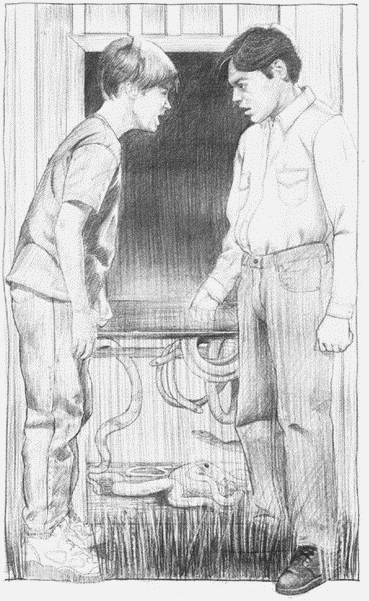 – Кто из них быстрее? – спросила Салли. – Эразм побеждает, если катится, – ответил Барри. – Эраст быстрее, но я не могу рассчитывать на него. Иногда он прыгает на стену, пытаясь сбежать и скрыться в траве. – Ты действительно видел Малыша Тигра в клетке? – справился Энциклопедия. – Сам знаешь, – заявил Барри. – Полчаса назад я вышел из дома. Малыш Тигр съел Эразма и покончил с Эрастом. Он уполз раньше, чем я успел его поймать. Салли возразила: – Ящерицы могли сбежать через дверцу клетки и остаться в живых. А в опустевшую клетку могла заползти другая змея. – Я отлично знаю, как выглядит Малыш Тигр, – сказал Барри. – Кроме того, дверца всегда заперта. А единственный ключ – у меня. – Продолжай, – заржал Спайк. – Захватывающая история! – Если бы ты кормил эту глупую змею, она не была бы голодна! – выпалил Барри в ответ. – Да ну? – зарычал Спайк. – Если ты прикусишь губу, наверняка умрёшь от отравления. – Где сейчас твоя змея, Спайк? – быстро вставила Салли. Спайк указал большим пальцем за плечо. – Дома. Он повёл их вниз по кварталу к своему дому. В маленьком открытом сарае на заднем дворе был большой стеклянный резервуар. Энциклопедия увидел удава, бирманского питона и семью безвредных травяных змей. Но не увидел черно-жёлтую змею Спайка. – Родители любят всяких рептилий, – сказал Спайк. – Они подарили мне Малыша Тигра как домашнего питомца. – Внезапно он ахнул. – Малыш Тигр! Он исчез! – Вот ты и проговорился, – заявил Барри. – Он где-то в траве. Спит, как следует наевшись. – Ты украл Малыша Тигра, чтобы он не смог завтра побить твои две кучки юрского мусора, – прорычал Спайк. – Змей не выставляют против ящериц, – указала Салли. – Верно, – согласился Барри. – Есть призы для победивших змеи, ящерицы и черепахи. Но главный приз достаётся тому, чей гонщик оценивается лучшим в целом. Спайк не мог смириться с тем, что Эразм или Эраст станут победителями. – Даю тебе честное предупреждение, – процедил Спайк. – Верни Малыша Тигра, или научись исцелять, да поскорее. Мальчишки снова подступили друг к другу. Салли отвела Энциклопедию в сторону. – Любой из них может пытаться лишить другого главного приза, – рассуждала она. – Барри мог спрятать Малыша Тигра, Эразма и Эраста с идеей «найти» ящериц непосредственно перед гонками, а змею – сразу после них. Спайк мог спрятать Малыша Тигра после того, как посадил его в клетку, чтобы тот съел Эразма и Эраста. Энциклопедия молча смотрел на пустую клетку. – Да скажи хоть что-нибудь! – завопила Салли. – Кто лжёт? Ты что, не знаешь? – Знаю, и мне обидно, что я так долго с этим возился, – извинился Энциклопедия. – Лжец – это... КТО?