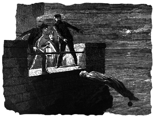 В ту же секунду Дантес почувствовал, что его бросают в неизмеримую пустоту, что он рассекает воздух, как раненая птица, и падает, падает в леденящем сердце ужасе… Хотя что-то тяжелое влекло его книзу, ускоряя быстроту его полета, ему казалось, что он падает целую вечность. Наконец, с оглушительным шумом он вонзился, как стрела в ледяную воду и испустил было крик, но тотчас же захлебнулся. Дантес был брошен в море, и тридцатишестифунтовое ядро, привязанное к ногам, тянуло его на дно. Море — кладбище замка Иф.