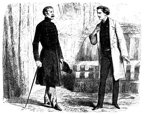 На глазах Вильфора блеснули слезы горделивой радости; он принял крест и поцеловал его. — Какие еще приказания угодно вашему величеству дать мне? — спросил Вильфор. — Отдохните, а потом не забывайте, что если в Париже вы не в силах служить мне, то в Марселе вы можете оказать мне большие услуги. — Ваше величество, — отвечал Вильфор, кланяясь, — через час я покину Париж. — Ступайте, — сказал король, — и если бы я вас забыл (у королей короткая память), то не бойтесь напомнить о себе… Барон, прикажите позвать ко мне военного министра. Блакас, останьтесь. — Да, сударь, — сказал министр полиции Вильфору, выходя из Тюильри. — Вы не ошиблись дверью, и карьера ваша обеспечена. — Надолго ли? — прошептал Вильфор, раскланиваясь с министром, карьера которого была кончена, и стал искать глазами карету. По набережной проезжал фиакр, Вильфор подозвал его, фиакр подъехал; Вильфор сказал адрес, бросился в карету и предался честолюбивым мечтам. Через десять минут он уже был у себя, велел подать лошадей через два часа и спросил завтрак. Он уже садился за стол, когда чья-то уверенная и сильная рука дернула звонок. Слуга пошел отворять, и Вильфор услышал голос, называвший его имя. «Кто может знать, что я в Париже?» — подумал помощник королевского прокурора. Слуга воротился. — Что там такое? — спросил Вильфор. — Кто звонил? Кто меня спрашивает? — Незнакомый господин и не хочет сказать своего имени. — Как? Не хочет сказать своего имени? А что ему нужно от меня? — Он хочет переговорить с вами. — Со мной? — Да. — Он назвал меня по имени? — Да. — А каков он собой? — Да человек лет пятидесяти. — Маленький? Высокий? — С вас ростом. — Брюнет или блондин? — Брюнет, темный брюнет; черные волосы, черные глаза, черные брови. — А одет? — с живостью спросил Вильфор. — Как он одет? — В синем сюртуке, застегнутом доверху, с лентой Почетного легиона. — Это он! — прошептал Вильфор бледнея. — Черт возьми! — сказал, появляясь в дверях, человек, приметы которого мы описывали уже дважды. — Сколько церемоний! Или в Марселе сыновья имеют обыкновение заставлять отцов дожидаться в передней? — Отец! — вскричал Вильфор. — Так я не ошибся… Я так и думал, что это вы… — А если ты думал, что это я, — продолжал гость, ставя в угол палку и кладя шляпу на стул, — то позволь тебе сказать, милый Жерар, что с твоей стороны не очень-то любезно заставлять меня дожидаться. — Идите, Жермен, — сказал Вильфор. Слуга удалился с выражением явного удивления.