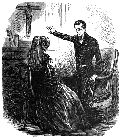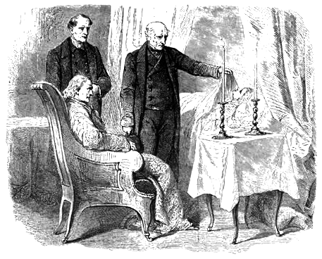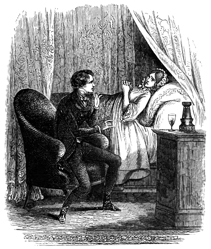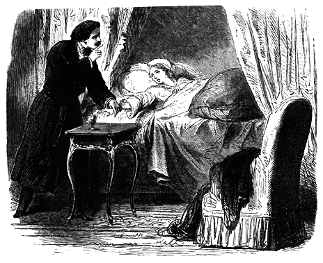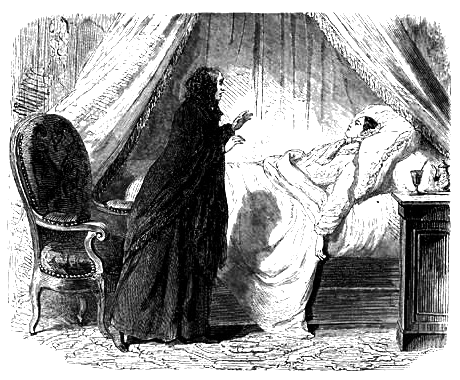 Как говорил королевский прокурор г-же Данглар, Валентина все еще была больна. Обессиленная, она не вставала с постели; о бегстве Эжени, об аресте Андреа Кавальканти, вернее — Бенедетто, и о предъявленном ему обвинении в убийстве она узнала у себя в комнате, из уст г-жи де Вильфор. Но Валентина была так слаба, что рассказ этот не произвел на нее того впечатления, которое, вероятно, произвел бы, будь она здорова. К странным мыслям и мимолетным призракам, рождавшимся в ее больном мозгу или проносящимся перед ее глазами, только прибавилось еще несколько неясных мыслей, несколько смутных образов, да и те вскоре изгладились, вытесненные собственными ощущениями. Днем Валентину еще связывало с действительностью присутствие Нуартье, который требовал, чтобы его кресло переносили в комнату внучки, и там проводил весь день, не спуская с больной отеческого взора; Вильфор, вернувшись из суда, проводил час или два с отцом и дочерью. В шесть часов Вильфор удалялся к себе в кабинет; в восемь часов приходил д'Авриньи, приносил сам микстуру, приготовленную для Валентины на ночь, затем уносили Нуартье. Сиделка, приглашенная доктором, заменяла всех и уходила лишь в десять или одиннадцать часов, когда Валентина засыпала. Уходя, она отдавала ключ от комнаты Валентины самому Вильфору, так что в комнату больной можно было пройти только из спальни г-жи де Вильфор, через комнату маленького Эдуарда. Каждое утро Моррель приходил к Нуартье справиться о здоровье Валентины, как ни странно, с каждым днем он казался все спокойнее. Прежде всего Валентина, хотя она все еще была в сильном нервном возбуждении, чувствовала себя с каждым днем лучше; а потом разве Монте-Кристо не сказал ему, когда он прибежал к нему сам не свой, что если через два часа Валентина не умрет, то она спасена? И вот Валентина жива, и уже прошло четыре дня. Нервное возбуждение, о котором мы говорили, не покидало Валентину даже во сне, или, вернее, в той дремоте, которая вечером овладевала ею; тогда, в ночной тишине, при тусклом свете ночника, который теплился на камине, под алебастровым колпачком, перед нею проходили тени, населяющие комнаты больных и колеблемые порывистыми взмахами незримых крыльев лихорадки. Тогда ей чудились то мачеха с грозно сверкающим взором, то Моррель, простирающий к ней руки, то люди, почти чужие ей, как граф Монте-Кристо; даже мебель, казалось ей в бреду, оживала и двигалась по комнате. И так продолжалось часов до трех ночи, когда ею овладевал свинцовый сон, не покидавший ее уже до утра. Вечером того дня, когда Валентина узнала о бегстве Эжени и об аресте Бенедетто, после ухода Вильфора, д'Авриньи и Нуартье, как только на церкви Св. Филиппа Рульского пробило одиннадцать, сиделка поставила возле больной приготовленное питье и, затворив дверь, направилась в буфетную, где, содрогаясь, слушала рассказы о мрачных событиях, третий месяц волновавших умы прислуги королевского прокурора. И в это самое время в тщательно запертой комнате Валентины разыгралась неожиданная сцена. После ухода сиделки прошло около десяти минут. Валентина уже час лежала в лихорадке, возвращавшейся к ней каждую ночь, и в ее мозгу, независимо от ее воли, продолжалась упорная, однообразная и неумолимая работа, беспрестанно и бесплодно воспроизводя все те же мысли и порождая все те же образы. И вдруг в таинственном, н