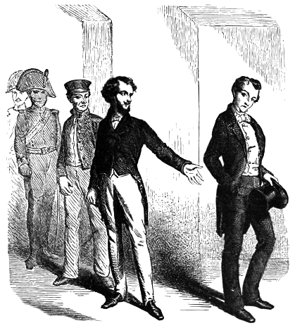 — Идем? — раздался нежный голос Мерседес. — Вот уже бьет два часа, а нас ждут в четверть третьего. — Да, да, идем, — сказал Дантес, быстро вставая. — Идем! — хором подхватили гости. В ту же минуту Данглар, который пристально следил за Фернаном, сидевшим на подоконнике, увидел, что тот дико вытаращил глаза, привскочил и снова сел на подоконник. Снаружи донесся неясный шум; стук тяжелых шагов, невнятные голоса и бряцание оружия заглушили веселый говор гостей, который сразу сменился тревожным молчанием. Шум приближался; в дверь три раза ударили. Гости с изумлением переглянулись. — Именем закона! — раздался громкий голос; никто не ответил. Тотчас дверь отворилась, и полицейский комиссар, опоясанный шарфом, вошел в залу в сопровождении четырех вооруженных солдат и капрала. Тревога сменилась ужасом. — В чем дело? — спросил арматор, подходя к комиссару, с которым был знаком. — Это, наверное, недоразумение. — Если это недоразумение, господин Моррель, — отвечал комиссар, — то можете быть уверены, что оно быстро разъяснится, а пока у меня есть приказ об аресте, и хоть я с сожалением исполняю этот долг, я все же должен его исполнить. Кто из вас, господа, Эдмон Дантес? Все взгляды обратились на Эдмона, который в сильном волнении, но сохраняя достоинство, выступил вперед и сказал: — Я. Что вам угодно? — Эдмон Дантес, — сказал комиссар, — именем закона я вас арестую! — Арестуете? — переспросил Эдмон, слегка побледнев. — За что вы меня арестуете? — Не знаю, но на первом допросе вы все узнаете. Моррель понял, что делать нечего: комиссар, опоясанный шарфом, — не человек; это статуя, воплощающая закон, холодная, глухая, безмолвная. Но старик Дантес бросился к комиссару; есть вещи, которые сердце отца или матери понять не может. Он просил, умолял. Слезы и мольбы были напрасны. Но отчаяние его было так велико, что комиссар почувствовал сострадание. — Успокойтесь, сударь! — сказал он. — Может быть, ваш сын не исполнил каких-нибудь карантинных или таможенных предписаний, и, когда он даст нужные разъяснения, его, вероятно, тотчас же освободят. — Что это значит? — спросил, нахмурив брови, Кадрусс у Данглара, который притворялся удивленным. — Я почем знаю! — отвечал Данглар. — Я, как и ты, вижу, что делается, ничего не понимаю и дивлюсь. Кадрусс искал глазами Фернана, но тот исчез. Тогда вся вчерашняя сцена представилась ему с ужасающей ясностью: разыгравшаяся трагедия словно сдернула покров, который вчерашнее опьянение набросило на его память. — Уж не последствия ли это шутки, о которой вы говорили вчера? — сказал он хрипло. — В таком случае горе тому, кто ее затеял, — в ней веселого мало. — Да нет же! — воскликнул Данглар. — Ведь ты знаешь, что я разорвал записку. — Ты не разорвал ее, — сказал Кадрусс, — а бросил в угол, только и всего. — Молчи, ты ничего не видел, ты был пьян. — Где Фернан? — спросил Кадрусс. — Почем я знаю? — отвечал Данглар. — Верно, ушел по своим делам. Но чем заниматься пустяками, пойдем лучше поможем несчастному старику. Дантес уже успел с улыбкой подать руки всем своим друзьям и отдался в руки солдат. — Будьте спокойны, ошибка объяснится, и, вероятно, я даже не дойду до тюрьмы, — сказал он. — О, разумеется, я готов поручиться! — подхватил подошедший Данглар. Дантес спустился с лестницы. Впереди него шел комиссар, по бокам — солдаты. Карета с раскрытой дверц
