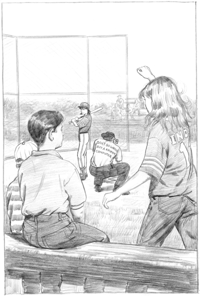– У судьи по дороге на стадион заглохла машина, – объяснил игрок. – Они вызывали замену, но никого не оказалось на месте. И если дублёра так и не найдут, нам придётся отложить игру. Один из отцов в секции «Дельфинов» подслушал их разговор. Он вскочил на ноги и помахал тренерам. – Я могу заменить арбитра! – В самом деле? – Тренер «Индейцев» посмотрел на него. – Вам приходилось судить на поле, сэр? – Безусловно, – уверенно ответил мужчина. – Я три года был судьёй в высшей лиге, прежде чем стал продавать компьютеры. – Хорошо, мистер Пейн, – ответил тренер «Дельфинов». – Вы в игре. Тренер «Индейцев» нашёл маску и накладки судьи[11]. Мистер Пейн надел снаряжение, и через минуту игра, наконец, началась. «Индейцы» взяли на себя инициативу в конце первого иннинга, когда Тара Падровски дважды вышибла мяч из парка. – Тара сегодня в ударе! – воскликнула Салли. Но к шестому иннингу Энциклопедия забеспокоился. «Индейцы» Айдавилля проигрывали, 5:2. Хуже всего было то, что Энциклопедия чувствовал: новый судья умышленно работает против «Индейцев». В четвёртом иннинге он удалил Джимми Риверу, который пытался украсть вторую базу. Джимми с точки зрения Энциклопедии и Салли выглядел безопасным. И после двух хоумранов Тары судья стал объявлять ей три страйка[12] каждый раз, когда она готовилась к удару. Теперь Тара стояла, готовясь нанести очередной удар. – Не подающему… Не подающему, – скандировал кто-то из секции индейцев. – Следи за мячом, Тара! – кричал ей отец. Прежде чем Тара подошла к базе, судья наклонился, чтобы расчистить её. Энциклопедия заметил слова «НЕ СОВЕРШАЙ ОШИБОК. КУПИ КОМПЬЮТЕР КРУММА» на спине его синей футболки. – Возможно, судья, наконец, отстанет от Тары и позволит ей попасть на базу, – предположила Салли. – Надеюсь, – ответил Энциклопедия. – Я не думаю, что «Индейцы» смогут выиграть,если она в ближайшее время не нанесёт хороший удар. Первая подача прошла высоко. Тара не сдвинулась с места. – Отлично, Тара! – завопил отец. Но судья придерживался другого мнения. – Стр-р-райк! – крикнул он. – Ты слепой? – взвилась ракетой Салли. – Этот мяч пронёсся выше луны! – Протри очки, крот! – заорал кто-то. Тара впилась взглядом в судью, переминаясь в грязи. Следующая подача снова прошла высоко, и судья объявил очередной страйк. Но Тара не теряла хладнокровия, пока третья подача не прошла широко и низко. – Третий стр-ррр-айк! Ты вышла из игры! Тара отбросила биту и подошла к своему тренеру. – Тренер, вы должны сделать что-то с этим типом! Он пытается заставить нас проиграть! Тренер Андерсон в гневе бросился к судье: – Мне казалось, вы заявляли, что умеете судить! Судья поднял маску и посмотрел на тренера. – Вам лучше держаться подальше, тренер! – рявкнул он в ответ. – В высшей лиге за такие оскорбления тренеров вышвыривают прочь[13]! – Он худший судья из всех, кого я когда-либо видела, – мрачно процедила Салли. Она опустилась на скамейку. – Одно дело, если бы «Индейцы» проиграли чемпионат из-за собственной скверной игры. Но если они проиграют из-за его неверных решений... – Поклонники сойдут с ума, – завершил Энциклопедия. Он пристально следил за судьёй, когда тот наклонился, чтобы расчистить базу для следующей подачи «Индейцев». Когда Энциклопедия снова прочитал слова на спине мужской футболки, что-то щёлкнуло у него в голове: – Мы должны остановить игру, Сал