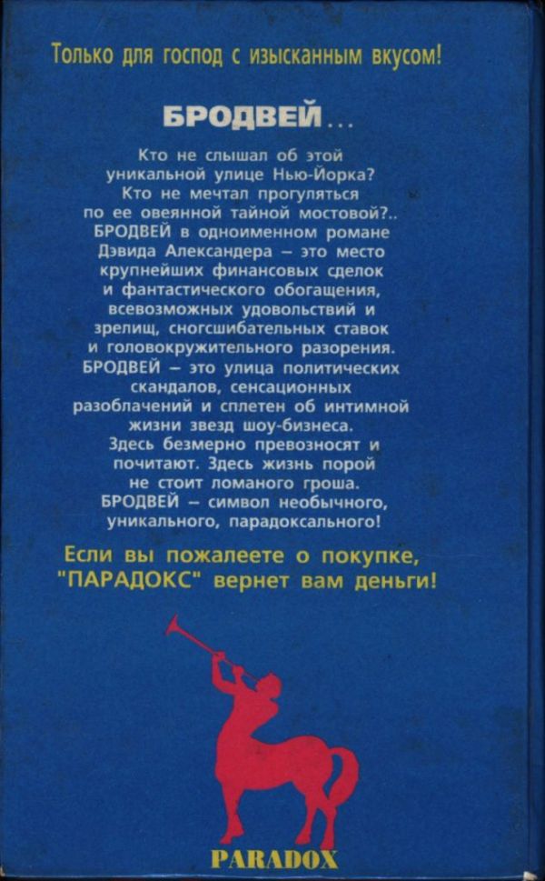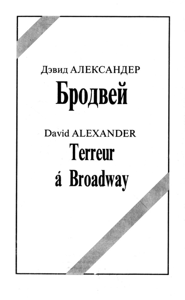 Кто не слышал об этой уникальной улице Нью-Йорка? Кто не мечтал прогуляться по ее овеянной тайной мостовой?.. БРОДВЕЙ в одноименном романе Дэвида Александра — это место крупнейших финансовых сделок и фантастического обогащения, всевозможных удовольствий и зрелищ, сногсшибательных ставок и головокружительного разорения на ипподроме или в казино. БРОДВЕЙ — это улица политических скандалов, сенсационных разоблачений и сплетен об интимной жизни звезд шоу-бизнеса. БРОДВЕЙ — это мир богемы и толстосумов, насильников и невидимых убийц. Здесь безмерно превозносят и почитают. Здесь жизнь человека порой не стоит ломаного гроша. БРОДВЕЙ — символ необычного, уникального, парадоксального! Читайте и восторгайтесь, негодуйте и осуждайте, низвергайте и превозносите!