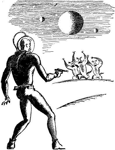 Исследования внутренней планеты и опыты со спорами мха заняли несколько больше времени, чем Белл предполагал, так что он оказался над крышей артнейского уранового завода лишь через семьдесят часов после расставания со Слимми. С тревогой посмотрел он туда, где оставил товарища и его пьяных подопечных. Ничего, только голый песок. Нахмурившись, Белл включил телескоп и стал вглядываться в поверхность планеты. Все признаки указывали на некоторую потасовку. Белл хорошо знал своего друга и мог предположить, что стычка была весьма серьезной, несмотря на то что любой марсианин втрое сильнее человека с Земли. Совершив посадку, Белл поспешно выбрался наружу и побежал к месту стоянки марсианского корабля. При его приближении входная дверь открылась, и показался Наш Парень. По нему было видно, что он страдает от изрядного похмелья. — Что тебе нужно? — Мне нужен Слимми. Что вы с ним сделали? — Мы вернем тебе твоего спутника, если ты отдашь нам то, что привез. — Вы убили его! Наш Парень сделал шаг в сторону. — Войди и убедись. Белл решительно вошел в корабль. Слимми в самом деле оказался там, и у него был покорный вид, так как его крепко держали железные руки Гулливера и Лилипута. — Привет, — сказал он. — Слимми! Что случилось? — Вспомни, что было с тобой в Цинциннати, у Берта. Белл вспомнил. Вообще-то гордиться в той истории ему было нечем. Он попытался перепить на спор шестерых рабочих борных шахт. После того случая он уже не забудет, что в определенных дозах алкоголь из источника высоких жизненных радостей превращается в самое натуральное рвотное. — А при чем здесь… — Они меня надули. Часов восемь после твоего вылета они пытались сопротивляться, и я поил их насильно, а потом на них как будто напала жадность, и они стали пить беспрерывно. А потом им стало плохо. По-настоящему плохо. И они стали трезветь. Я усиленно поил их, а из них все выливалось, галлон за галлоном. Не знаю, как они вызывали рвоту, но факт остается фактом: у меня закончилась кола. Надо было их сразу убить. — Успеем, — мрачно сказал Белл. — Ладно, ребята, отпускайте его. Он спокойно сунул руку в карман и извлек небольшой темный пистолет. Марсиане вздрогнули. — Откуда это? — спросил Гулливер. — Вы обещали, что позволите нам уничтожить все оружие, что было у вас на борту. Все наше оружие уничтожено. Что же это такое? И снова Белл пожалел о том, что голоса марсиан лишены интонации. Сейчас ему до смерти хотелось, чтобы самый высокий из его врагов злился и брызгал слюной. — Это именно то, — проговорил Белл, посторонившись, чтобы дать возможность освобожденному Слимми выйти из корабля, — что мы на Земле называем тузом в рукаве. В общем, приятно было с вами познакомиться. Уверенно держа марсиан под прицелом, он покинул корабль.* * *