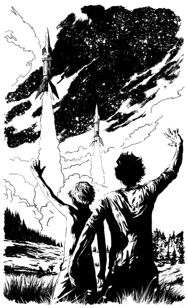 Ло Вей и Патрик просматривали смонтированную кинограмму. …Земля на экране была такой, какой ее видят возвращающиеся из рейса астронавты: большой шар, укутанный голубой вуалью атмосферы, сквозь нее смутно обозначаются пестрые пятна континентов и островов в сине-сером пространстве океана; белые нашлепки льдов на полюсах и, будто продолжение их, белые пятнышки туч и айсбергов. Контуры материков расширялись, наполнялись подробностями: коричневыми ветвистыми хребтами, сине-зелеными лесными массивами, голубыми пятнами и линиями рек и озер. Горизонт опрокинулся чашей с зыбкими туманными краями. Внизу стремительно проносятся тонкие серые линии автострад, скопления игрушечно маленьких зданий, желтые прямоугольники пшеничных полей, обрывающийся скалами берег и — море, море без конца и края, в сине-зеленых бликах играющей под солнцем воды. Вот телеглаз мчит их по улицам Астрограда — мимо куполов и стометровых мачт Радионавигационной станции, мимо отделанных разноцветным пластиком жилых домов, мимо гигантских ангаров, где собирают новые ракеты. Всюду люди. Они работают в ангарах, идут по улицам, спорят, играют в мяч на площадках парка, купаются в открытых бассейнах. Рослые, хорошо сложенные, в простых одеждах, с веселыми или сосредоточенными лицами — они красивы. Эта красота лиц, тел, движений, осанки не была нечаянным даром природы, щедрой к одним и немилостивой к другим, — она пришла к людям как результат чистой, обеспеченной, одухотворенной трудом и творчеством жизни многих поколений. Шли обнявшись девушки по краю улицы. Под темнолистым дубом возились в песке дети. Город кончился. Теперь Ло и Патрик мчались между скал и строений по извилистому шоссе — к космодрому, к жерлу пятисоткилометровой электромагнитной пушки, нацеленной в космос. Они снова поднялись в воздух и сейчас видели целиком блестящую металлическую струну, натянутую между Астроградом и высочайшей вершиной Гималаев — Джомолунгмой. Вот из жерла пушки в разреженное темно-синее пространство алюминиевой стрелой вылетела вереница сцепленных грузовых ракет… Экран погас, кинограмма кончилась. Ло Вей и Патрик молча сидели в затемненной радиорубке звездолета, боясь хоть словом спугнуть ощущение Земли. В напряженной работе, в бесконечном потоке новых впечатлений астронавтам некогда было думать о Земле. Они сознательно отвыкали от мыслей о ней. Но сейчас Земля спокойно и властно позвала их-и они почувствовали тоску… Нет, никаким кондиционированием воздуха не заменить терпкий запах смолистой хвои и нагретых солнцем трав, никакие миллиарды космических километров, пройденных с околосветовой скоростью, не заменят улиц, по которым можно просто так идти — руки в карманы — и смотреть на прохожих; никогда мудрая красота приборов и машин не вытеснит из сердца человека расточительной, буйной и нежной, яркой и тонкой, тихой и грозной красы земной природы. — Эх, под дождь бы сейчас, — вздохнул Патрик. — Босиком по лужам, как в детстве. «Дождик, дождик, пуще — расти трава гуще!» — А на лужах от капель пузыри выскакивают, — подхватил Ло. — Веселые такие. И лопаются… — Ладно, хватит об этом, — сказал Патрик, сердясь на себя и на товарища. — Готовь телемонитор. Странно, что капитан не разрешил показать им весь наш участок неба. Осторожничает… Пол радиорубки вдруг мягко дрогнул, будт