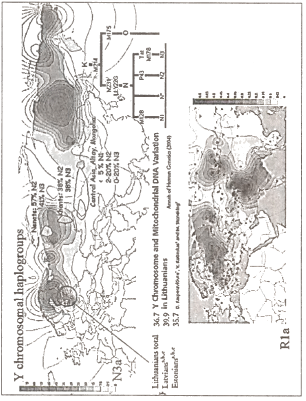 Вообще говоря, среди русских представлена не сама N, а подгруппа N1c (прежде её обозначали как N3, но в 2008 году классификацию изменили). И вот она-то как раз распространена в объёме более 50 % среди финно-угорских и балтских народов. При этом она практически отсутствует в генофондах западных и южных европейцев. Интересно, что так мало, казалось бы, общего имеющие между собой балты и финны вместе оказываются в этой группе. Правда, по материнским линиям ДНК в ней выявляются две внутренние ветви— юго-западная и северо-восточная. То есть наборы всё же разные: с одной стороны — литовцы и латыши, с другой — финны, включая эстонцев. Это важно запомнить, когда мы вернёмся к балтской теме позднее. В России гаплогруппа N1c географически представлена неравномерно: варьирует от 5 % в Калужской области до 35 % в Псковской. Среди поморов Архангельской области данная группа встречается практически так же часто, как и у финнов. Как это далеко от «р-один-цев», т. е. носителей R1a? Гаплотипы группы N обычно имеют вид: