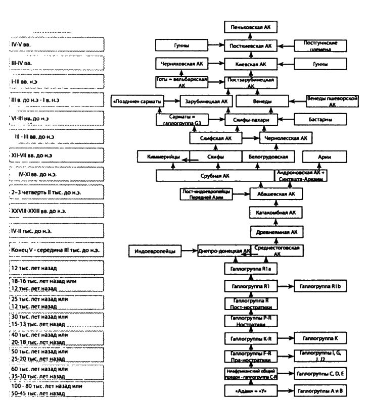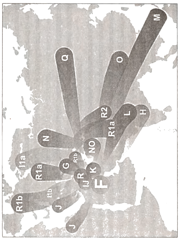 Это так называемые STR-маркеры. И последнее понятие, которым мы будем оперировать, — «снип». Точнее, по-научному, — SNP-гаплотип. Он тоже показывает мутации, но на отдельных нуклеотидах в ДНК. И потому даёт независимую ДНК-характеристику как каждому человеку, так и группе людей. Также передаётся по наследству. Это — редкая мутация, одна примерно в 5—10 тысяч лет, а потому — весьма полезный исторический маркер. Мутации происходят с определённой вероятностью. Эти вероятности складываются. А сами мутации возможны в любую сторону, как увеличивая число повторов, так и уменьшая его. А потому весь 6-маркерный гаплотип меняется чаще, чем один, о котором говорилось в самом начале. В результате от предка с определённым маркерным «паспортом», «начавшего» новую группу мутаций (У(АО), условно), через многие поколения получается не один, а целый набор гаплотипов. Как говорят, образуется «облако» гаплотипов, группирующееся вокруг базового. Но вернёмся к нашему первобытному охотнику. Как мы видели, мутации приводят к тому, что потомки даже одного родоначальника — вроде бы родственники, но с разными записями в «паспортах». И когда мы сверим эти записи у представителей разных нынешних этносов, то сразу увидим, кто из них потомок тов. У, а кто, к примеру, тов. Авраама. Который, впрочем, тоже является потомком У. Ибо общим предком всех мужчин человечества, как показывает генетика, был один-единственный мужчина. И жил наш самый первый родоначальник около 80 тысяч лет назад в Африке. Прежде чем пойти дальше, добавим ещё одну важную деталь, поясняющую, почему я подчёркнуто упомянул именно мужчин. Поскольку школьницы от школьников отличаются не только романтичностью, но и наличием Х-хромосомы, то мужские «паспорта» наследуются мальчиками, а женские — девочками. И вот именно по линии мутаций мужских У-хромосом тот самый первобытный «Адам» и был идентифицирован. Куда делись предки самого «Адама», его коллеги по работе в первобытном коллективе, а также соседи и просто хорошие люди, мы не знаем. По крайней мере, на нынешнем этапе развития генетических исследований. Мы просто видим, что от них не осталось У-хромосом. Как это может произойти, я сам не очень понимаю. Возможно, частью их решили тогдашнюю продовольственную проблему. Или в ходе какого-то катаклизма погибли все мужчины с другими гаплотипами. Людей-то на планете было тысяч 20 всего. Примем это как факт. Так же как то, что «жена» тов. У родилась примерно за 80 тысяч лет до него. Во всяком случае, по женской линии всё человечество происходит от этой «генетической «Евы». От которой оно несёт митохондриальную ДПК, как от «Адама» — У-хромосому. А теперь — последнее из понятийного аппарата. Если у каждого человека есть свой гаплотип, то, естественно, у группы людей с похожими гаплотипами существует соответствующая общая групповая характеристика. Она называется гаплогруппой. Понятно, что у тех, кто имеет одну и ту же гаплогруппу, был общий предок. Не только самый первый, общий для всех У, а и кто-то из его разбредшегося по Ойкумене потомства. Все эти У (АБИ), У(АБІЦ), У(АБЛК) и прочие. Таких гаплогрупп на данный момент выделено двадцать, с обозначением от А до Т. Затем идут подгруппы, обозначаемые цифрами. Например, в гаплогруппе R существуют подгруппы R1 — это народы Европы и Западной Азии — и R2, в которую входят этносы Индии, Це