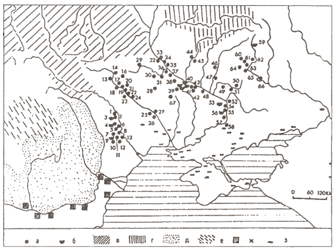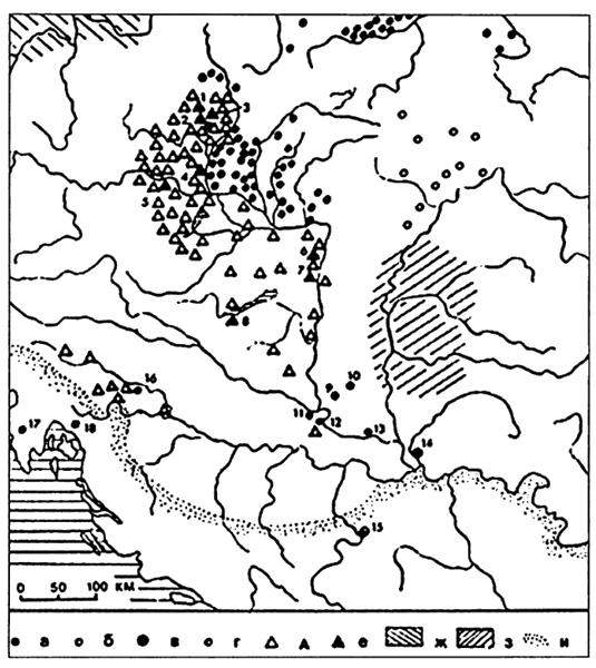 Эти памятники и синхронные им селища и городища сближаются с культурами более южных областей типа луки-райковецкой и роменско-боршевской —