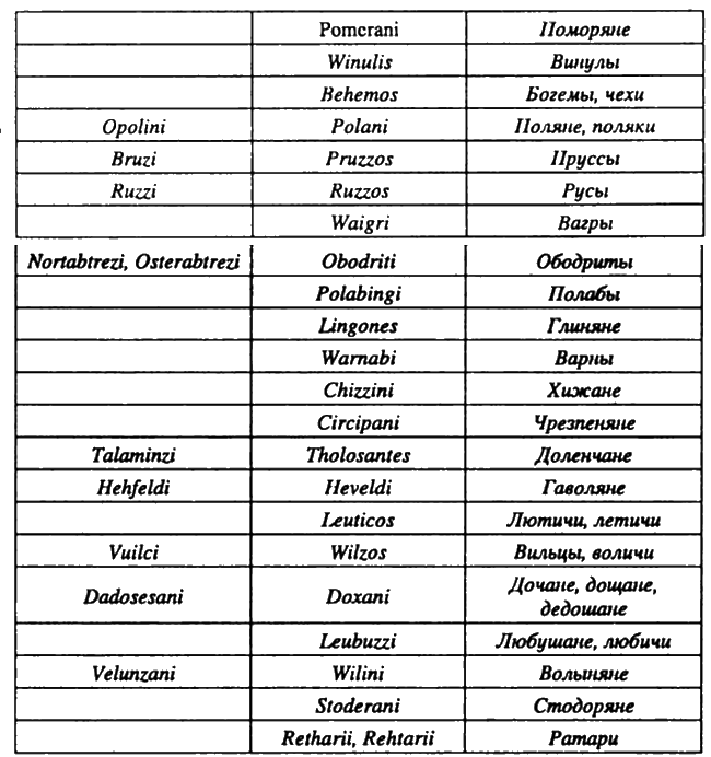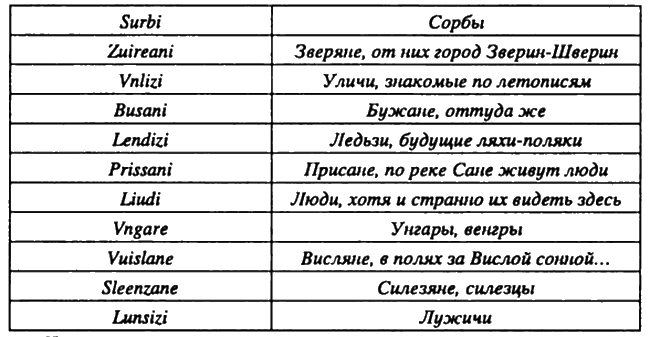 По мнозѣхъ же временѣхъ сѣлѣ суть словени по Дунаеви, кде есть нынѣ Угорьская земля и Болгарьская. <…> От тѣхъ словенъ разидошася по земьли и прозвашася имены своими, кде сѣдшс на которомъ мѣстѣ. <.. > Волохомъ бо нашедшим на словены па дунайскые, и сѣдшимъ в нихъ и насиляющимъ имъ. Словѣне же ови пришедше и сѣдоша на Вислѣ, и прозвашася ляховѣ, а от тѣхъ ляховъ прозвашася поляне, ляховѣ друзии — лютицѣ, инии мазовшане, а инии поморяне. Такоже и тѣ же словѣне, пришедше, сѣдоша по Днепру и наркошася поляне, а друзии деревляне, зане сѣдоша в лѣсѣхъ, а друзии сѣдоша межи Припѣтыо и Двиною и нарекошася дреговичи, и инии сѣдоша па Двинѣ и нарекошася полочане, рѣчькыради, яже втечетъ въ Двину, именемъ Полота, от сея прозвашася полочанѣ. Словѣне же сѣдоша около озера Илмера, и прозвашася своимъ именемъ, и сдѣлаша городъ и нарекоша и Новъгородъ. А друзии же сѣдоша на Деснѣ, и по Семи, и по Сулѣ и наркошася сѣверо. И тако разидеся словенескъ языкъ, тѣмьже и прозвася словеньская грамота.