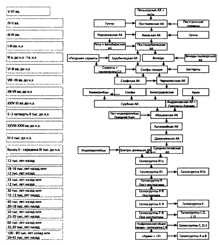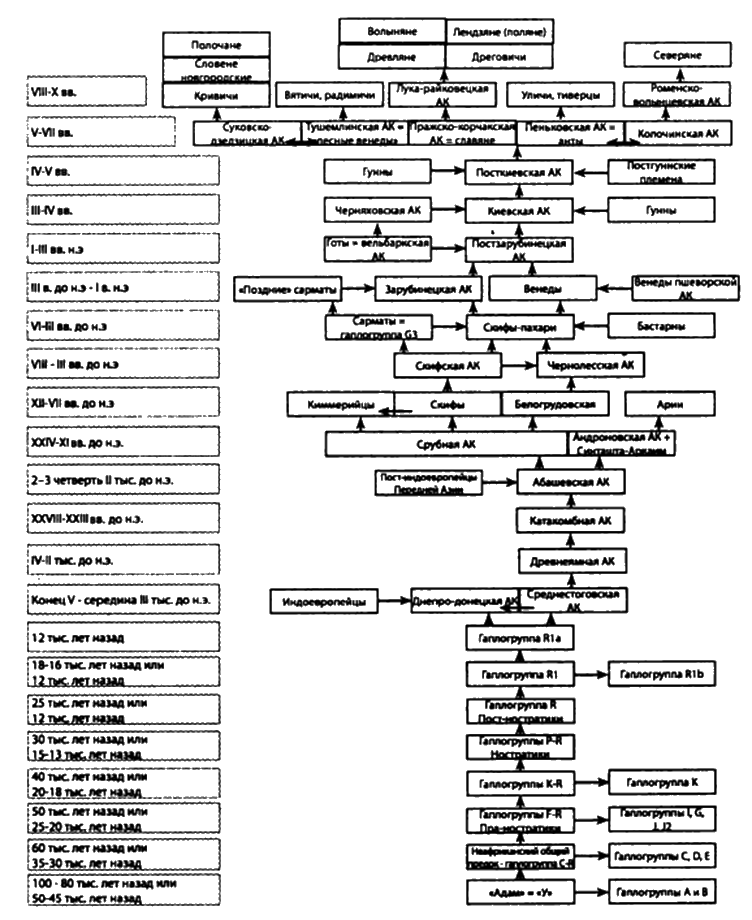 Необходимо предупредить: в нижеприведённом списке литературы — не только те источники, которые я цитировал в этой работе, но и те, что использовал косвенно — для справки, для сверки, для общего образования. Думаю, они могут пригодиться и читателю для собственного исследования. Так что можно сказать, это — рекомендованная литература.[1]. Analysis of one million base pairs of Neanderthal DNA // Nature 444, 330–336 (16 November 2006). [2]. Annales Bcrtiniani. 839 //Quellcn zur karolingischen Reichsgeschichte. B. etc, T. 2. [3]. Atkinson, Q.D. and Gray, R.D. How old is the Indo-European language family? Illumination or more moths to the flame? In: Phylogenetic Methods and the Prehistory of Languages. Cambridge: The McDonald Institute for Archaclogical Research, 2006. [4]. Barac, L., Pericic, M., Klaric, I.M., Rootsi, S., Janicijevic, B., Kivisild, T., Parik, J., Rudan, I., Villems, R, andRudan, P. Y chromosomal heritage of Croatian population and its island isolates. Europ. J. Human Genetics 11 (2003). [5]. Cadenas, A.M., Zhivotovsky, L.A., Cavalli-Sforza, LL, Underhill, P.A. and Herrera, R.J. Y-chromosome diversity characterizes the Gulf of Oman. Eur. J. Human Genetics, 18 (2008). [6]. Chandler, J.F. Estimating per-locus mutation rates. J. Gen. Genealogy, 2 (2006). [7]. Gray, R.D. and Atkinson, Q.D. Language-tree divergence times support the Anatolian theory of Indo-European origin. Nature (2003). [8]. Hans J. Holm: A possible Homeland of the Indo-European languages, http: //www.hjholm.de./ [9]. Herrmann, J. Germancn und Slawen in Mitteleuropa. Zur Neu-gcstaltung der cthnischen Verhaeltnisse zu Beginn des Mittelalters. Berlin, 1984. [10]. http: //diunov.livcjoumal.com [11]. http: //fandag.ru [12]. http: //forum.kursknet.ru [13]. http: //forum.ossetia.ru [14]. http: //forum.xlegio.ru [15]. http: //gazcta.ru [16]. http: //gklimov.livejoumal.com [17]. http: //gpr63.livejoumal.com [18]. http: //historic.ru/books [19]. http: //mythology.wcbhost.ru [20]. http: //www.nature.com [21]. http: //nasledic.dubna.ru [22]. http: //oldru.narod.ru [23]. http: //orci.livcjoumal.com [24]. http: //svolkov.livejoumal.com [25]. http: //tiamat.ru [26]. http: //valdcmarus.livejoumal.com [27]. http: //wicdcrda.livcjoumal.com [28]. http: //www.asha-pitcr.ru/ll_01_News/ll_02_arheology_ko-stcnki.htm [29]. http: //www.deryabino.ru [30]. http: //www.historica.ru [31]. http: //www.hrono.info [32]. http: //www.krotov.info [33]. http: //www.kurgan.kicv.ua [34]. http: //www.lants.tellur.ru [35]. http://www.ipiran.ru/egorov/gore.htm — _ftnrefl5http: //www. nasled.org/history/arhcologia [36]. http: //www.vostlit.info [37]. Jonathan Adams. Europe during the last 150 000 years, на I nercEUROPE.html. [38]. http: //korostcn.osp-ua.info [39]. M. Alinei. Towards an Invasionlcss Model of Indoeuropcan Origins. The Continuity Theory. [40]. Martinez, L., Underhill, P.A., Zhivotovsly, L.A., Gayden, T., Mo-schonas, N.K., Chow, C.-E. T., Conti, S., Mamolini, E., Cavalli-Sforza, LL and Herrera, R. J. Paleolitic Y-haplogroup heritage predominates in a Cretan highland plateau. Eur. J. Human Genetics, 15 (2007) [41]. Foster, A. Variations of Rib Ydna in Europe: Distribution and Origins. 2005. [42]. Snorri Sturluson Heimskringla. [43]. WiikK. Where did European men come from? I I Genetic Genealogy, 4 (2008) [44]. www.archaeology.ru [45]. www.discovers.ru [46]. www.dnatrec.ru, ныне — http: //www.molgcn.org [47]. www.ru.wikipedia.org [48]. www.socionet.ru [49]. Ynglinga saga, Halfdanar saga svarta. [50]. Авдусин Д. А. Гнсздово и Днепровский путь. В кн.: Новое в археологии. М., 1972. [51]. Авдусин Д. А. Отчёт о раскопках в Гнездове 1957–1960 гг. // Материалы по изучению Смоленской области. М., 1970. [52]. Авдусин Д. А. Скандинавские погребения в Гнездове. [53]. Авенариус А. Авары и славяне: Держава Само // Раннефеодальные государства и народности. М., 1991. [54]. Авеста. Избранные гимны из Видсвдата. М., 1993. [55]. Агафий Миринейский. О царствовании Юстиниана. М., 1996. [56]. Адам Бременский. Деяния архиепископов Гамбургской церкви. — http: //www.vostlit.info [57]. Алексеев А.ІО. Скифская хроника. СПб., 1992. [58]. Алексеев В. П. Палеоантропология земного шара и формирование человеческих рас. Палеолит. М.: Наука, 1978. [59]. Алексеев В. П. Положение Тешик-Ташской находки в системе гоминид//Антропологическая реконструкция и проблемы палеоэтнографии. М.: Наука, 1973. [60]. Алексеев Л. В. Некоторые вопросы заселенности и развития западнорусских земель в IX–XIII вв. // Древняя Русь и славяне. М.» 1978. [61]. Алексеев С. В. Славянская Европа V–VI вв. М.: Вече, 2008. [62]. Алексеева Т. И. Антропологический состав восточнославянских народов и проблема их происхождения//Этногенез финно-угорских народов но данным антропологии. — М.: Наука, 1974. [63]. Алекшин В. А. Социальная структура и погреба