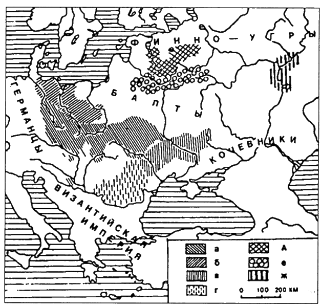ИТАК: VI–IX века. Продолжается распространение славянских племён по Русской равнине. При этом в русской летописи отмечено разделение этих племён по какому-то признаку отношения к славянскому языку — в данном случае в понимании славянского народа. Оказывается, в этот список «истинных» славян действительно входят племена, берущие начало в пражско-корчакской культуре. А не входят в него представители Пеньковской культуры и племя вятичей. Сопоставление с арабскими известиями, а также археологическими материалами позволяет говорить о том, что вятичи — продолжение и потомки венедов, оставшихся после распада киевской культуры на лесной территории и не мигрировавших на Дунай. Потому их в «списке» и нет. В этом свете ещё более очевидным становится не этнический, а обобщающий, сборный, «суперэтнический» характер термина «славяне», употребляемого русским летописцем. Этнически славяне — только население пражско-корчакской культуры, но уже в Древней Руси бытовало для этих славян и этническое, племенное именование — дулебы, возможно, перенятое от авар (см. рис. 42).