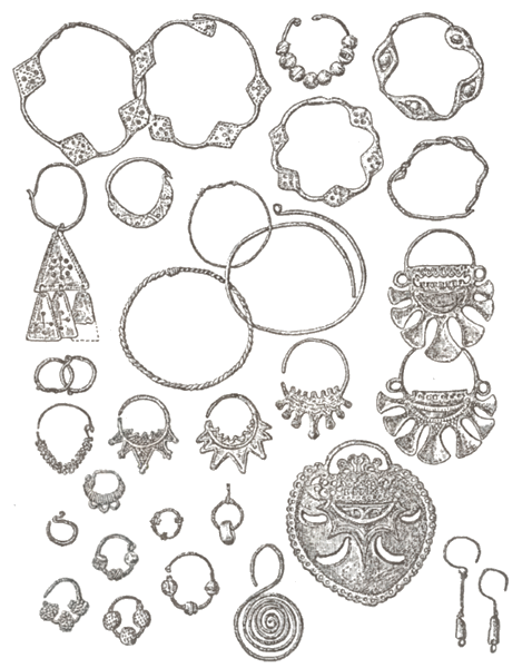 — проволочные биэсовидные украшения, полусферические бляхи, металлические трапециевидные и грибовидные привески, привески в виде птичек, —